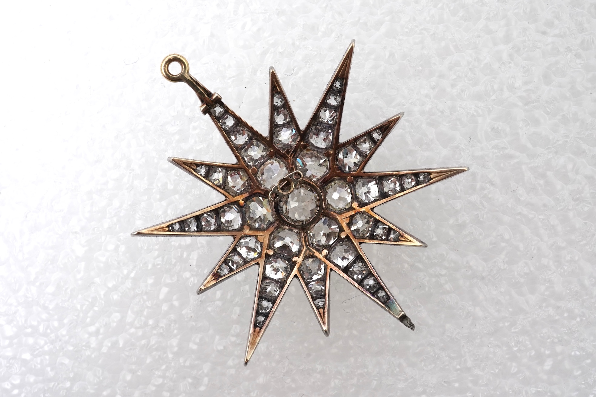 A Victorian diamond brooch/pendant, late 19th century, designed as a star, set with cushion-shaped diamonds totalling approximately 7.00 carats, the central diamond estimated to weigh approximately 1.00 carat, mounted in silver and gold, length 4.7cm, retractable pendant fitting, detachable brooch fitting, original fitted case initialled MLM,