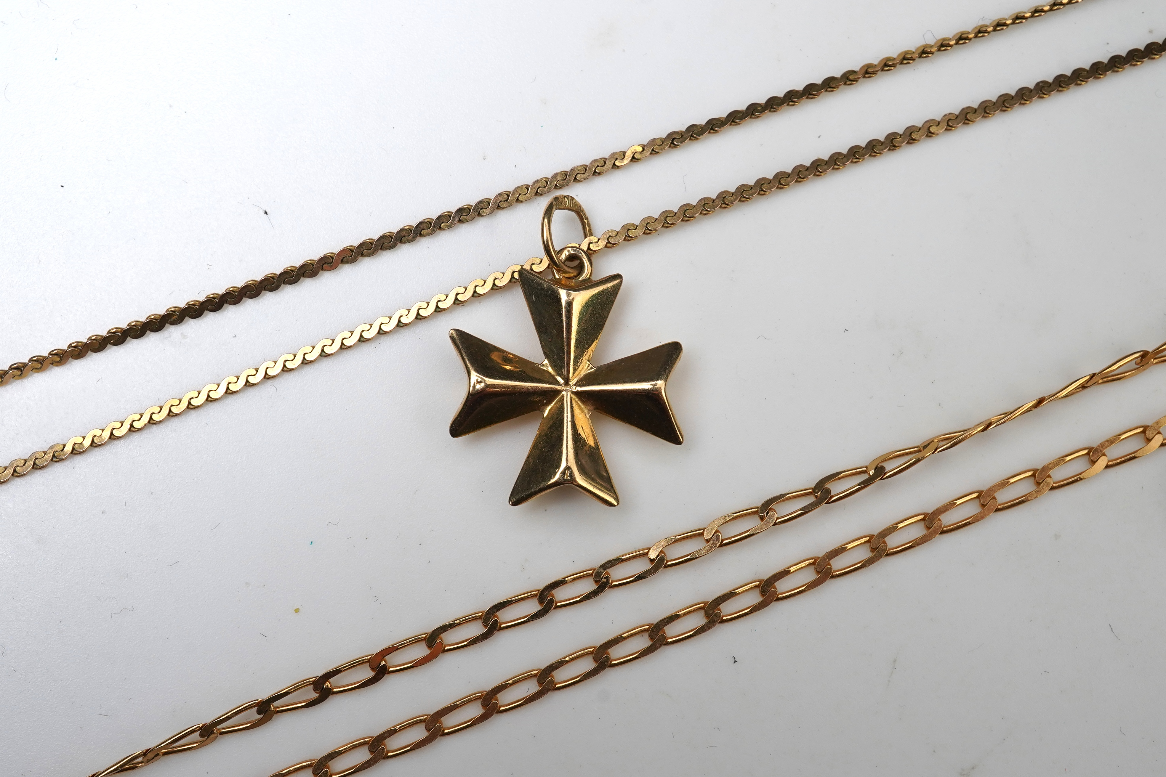 A collection of jewels, comprising: a dress ring of textured design set with sapphires in an 'S'-shaped arrangement; an onyx signet ring; a garnet and diamond half-hoop ring; a ruby and diamond half hoop ring; a diamond ring and matching pendant; a diamond half hoop ring; a figaro chain bracelet; and an opal, emerald and cubic zirconia cluster pendant necklace, one emerald deficient, all with British hallmarks for 9ct gold, combined gross weight approximately 29 grams; a faience scarab ring mounted in gold, size R, stamped 15CT, gross weight approximately 4 grams; a platinum wedding band, size L, inscribed 'ALL MY LOVE', dated 29.5.48, gross weight 3 grams; a heart-shaped locket and a Maltese cross pendant, each on chains, each stamped 375, combined gross weight approximately 11 grams; a wide wedding ring, size U, gross weight approximately 4 grams; and a bar brooch centring on a beetle motif set with an untested pearl, mounted in gold and platinum, gross weight approximately 2.5 grams; and a purple paste and rolled gold pendant