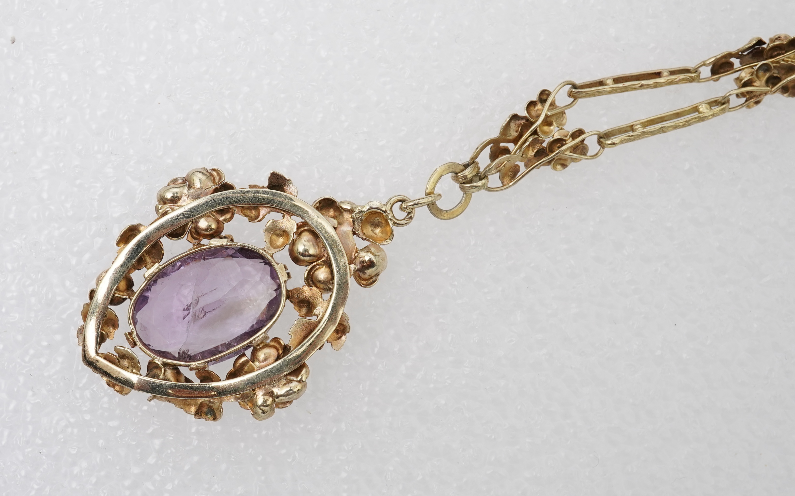 An amethyst ring, necklace and pendant, comprising: an oval amethyst set in a floral gilt silver necklace, length 32cm; an oval amethyst and seed pearl pendant, length 3.7cm; and a ring set with an oval amethyst, mounted in gold, size I, stamped 585, gross weight approximately 10 grams