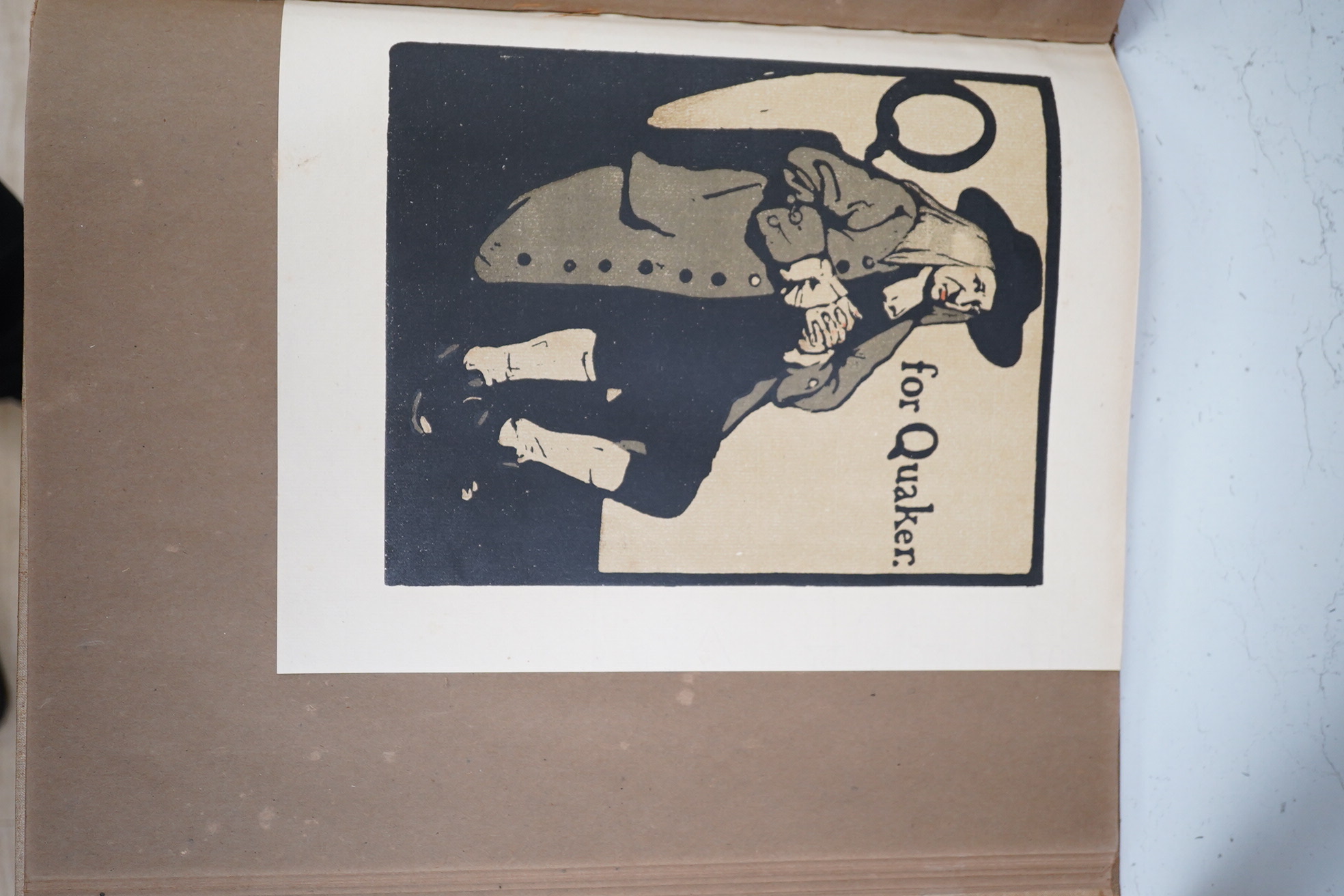 ° Nicholson, William, An Alphabet (Library Edition). tipped in title page and 26 colour lithographs on hand made wove paper, publisher's buckram, titles in black with colour pictorial design to upper board and publisher's device to rear, folio. William Heinemann, 1898.