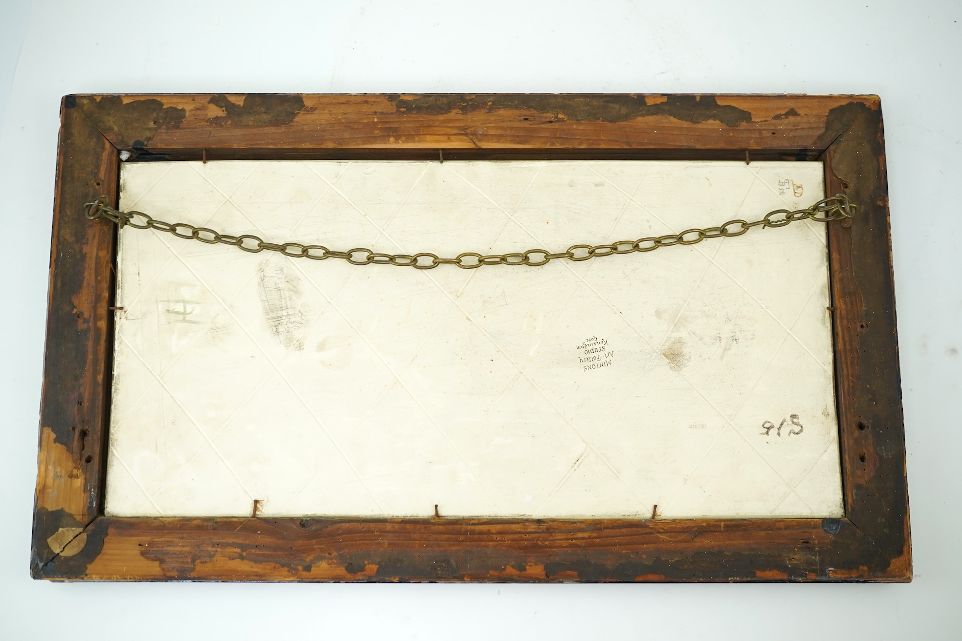 A Mintons Art Pottery Studio pottery plaque, designed by Henry Stacey Marks, late 19th century, ‘Lover', third panel from a series the 'Seven Ages of Man' depicting a gentleman penning a letter with two cranes beside him, impressed Minton, printed mark Mintons Art Pottery Studio Kensington Gore, 25.2cm x 50cm, framed