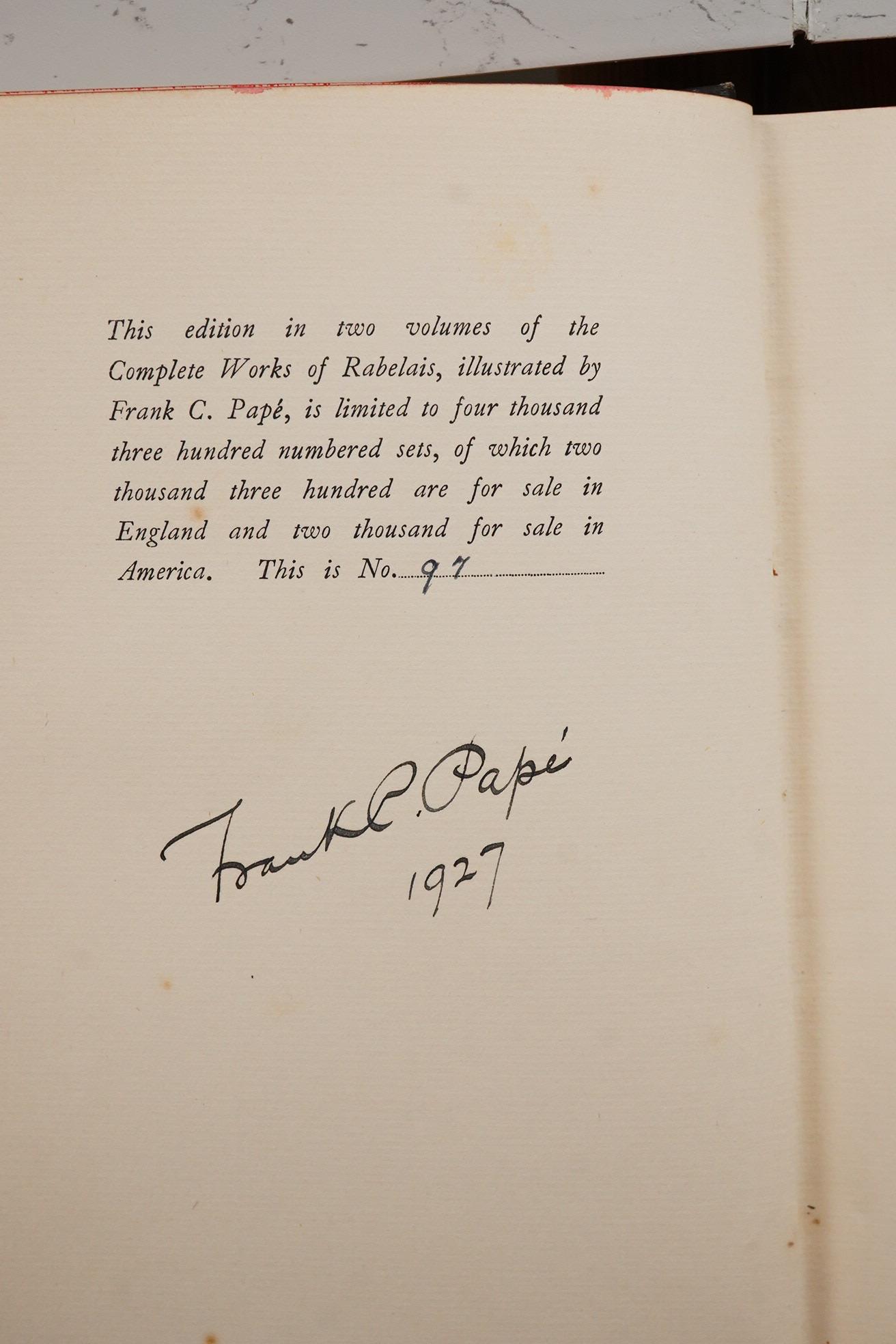 ° Rabelais, Francois. Complete Works illustrated by Franck. C Pape. In Two volumes, limited edition 97/4300 signed by the illustrator. publisher's cloth gilt. Bodley Head. 1927