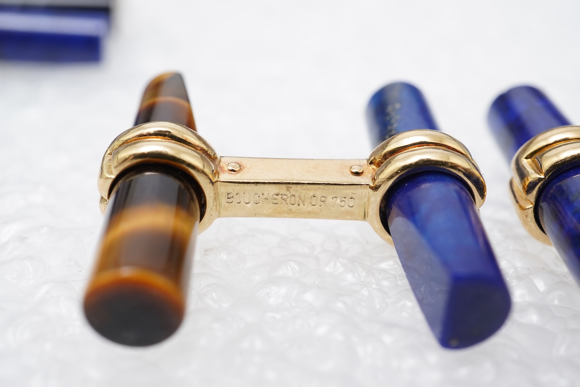 Boucheron, a pair of gold and hardstone cufflinks, each of bar design, each end terminating in a hoop, holding interchangeable batons of lapis lazuli, tiger's eye and onyx, in gold, each signed Boucheron, French assay marks for 18ct gold, French maker's mark for Boucheron, baton length 2.2cm each, fitted case stamped Boucheron