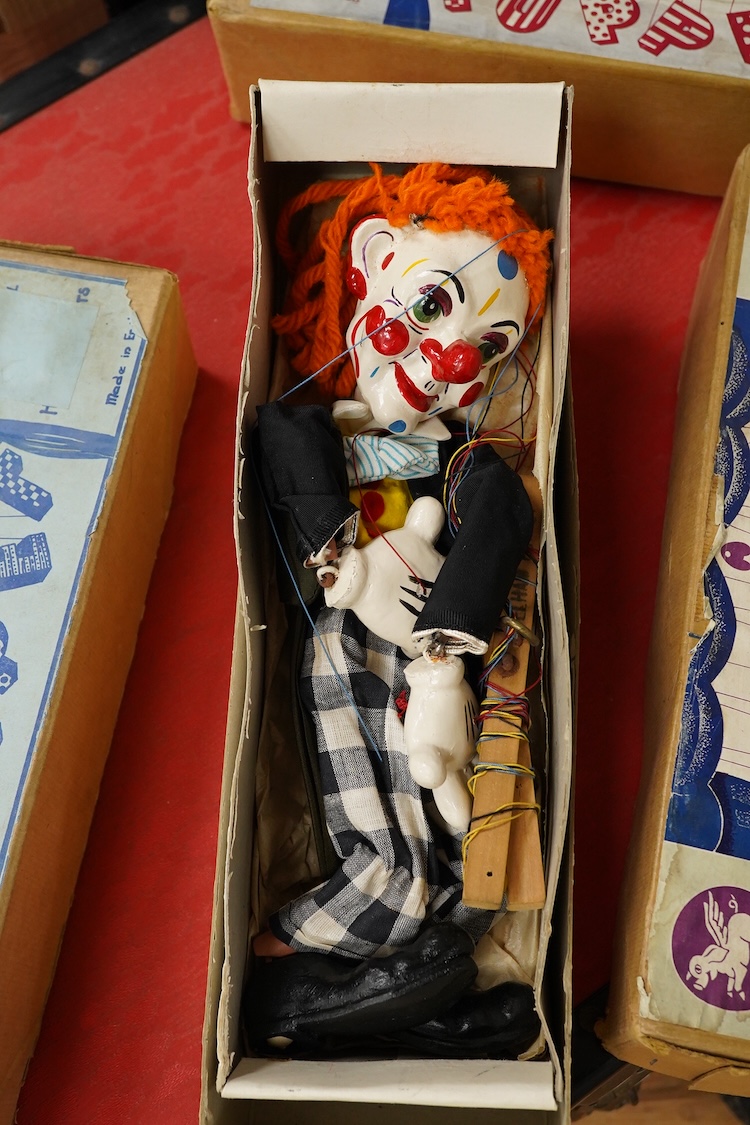 Lot 338 , Five boxed Pelham Puppets including; a Type SL Hansel, Gretel, Bembo the Clown, the Policeman with moving mouth, Mr. Turnip