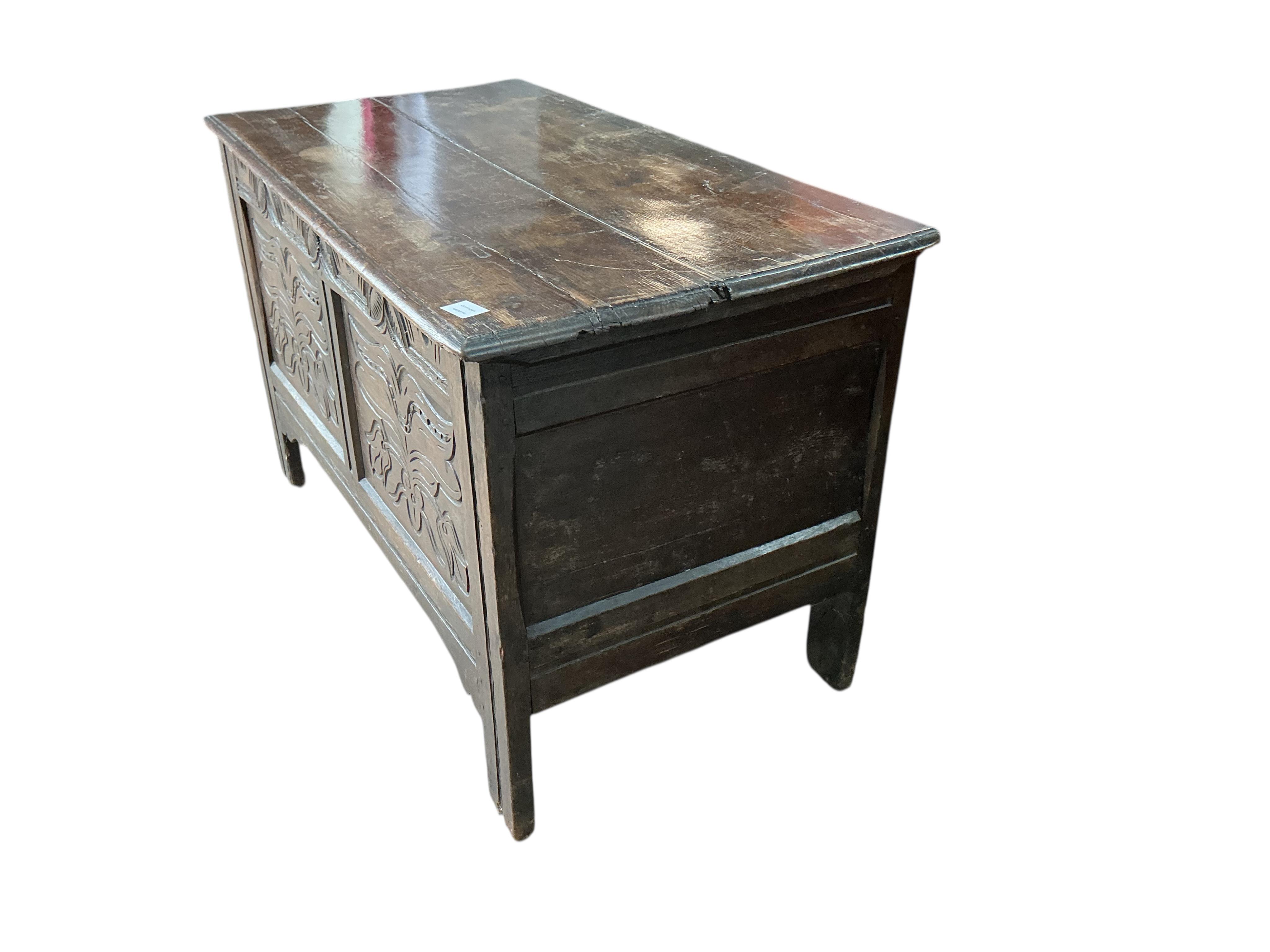 Lot 1010 , An early 18th century carved oak coffer, width 118cm, depth 60cm, height 69cm