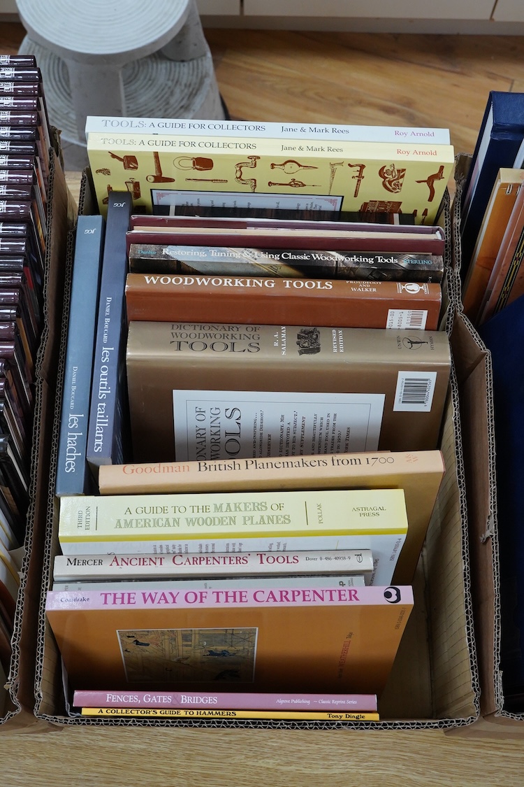 ° Three boxes of woodworking related books, titles include; The Art of Woodworking series, Dictionary of Woodworking Tools, British Planemakers from 1700, A Guide to the Makers of American Wooden Planes, Ancient Carpenter’s Tools, Stanley Tools, The Book of Boxes, The Art of Fine Tools, etc.