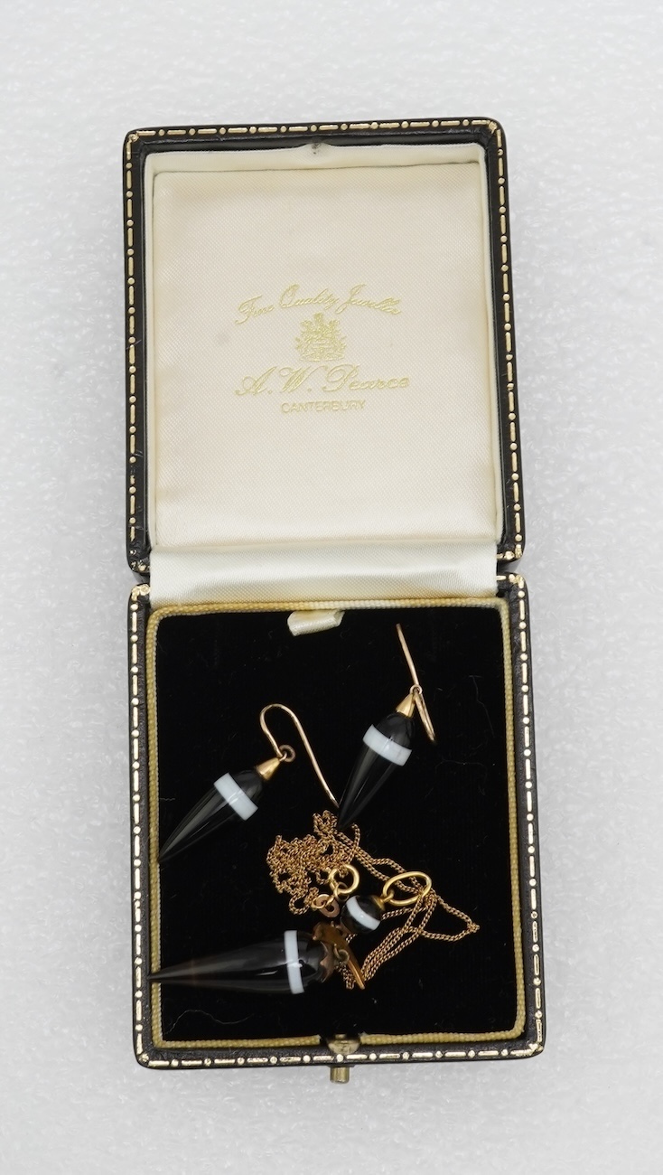An onyx demi-parure, early 20th century and later, comprising: a pendant, set with a banded onyx bead suspending a crescent moon motif set with seed pearls and a pointed onyx drop, to a later gold chain, pendant length 5.4cm, chain length 40cm, stamped 750; and a pair of similar onyx drop earrings, hook fittings, length 3.4cm each
