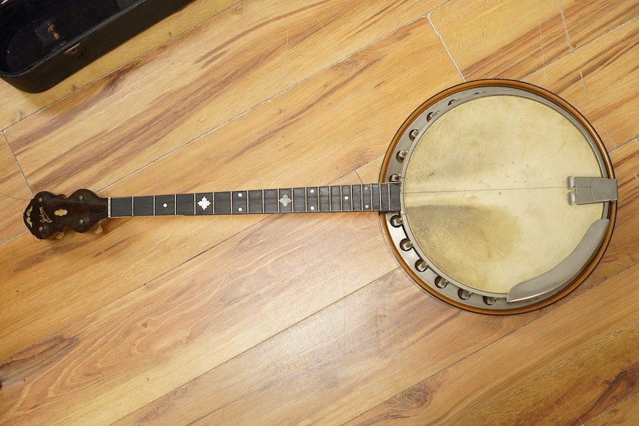 Lot 499 , A cased Jedson 4-string tenor banjo, with marquetry decoration and bird’s eye maple back