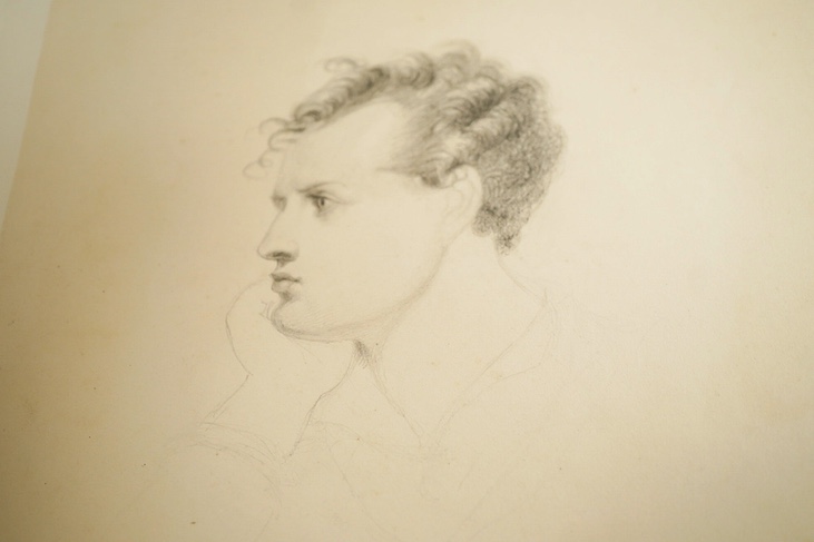 Cramer, Johann Baptist (1771-1858). Allegretto scherzando. Autograph music manuscript signed and dated 1832, one leaf, loosely laid down, together with one other music manuscript (4pp.) on embossed paper by Neukomm, (Sigismund). Song in Shakespeare's Twelth Night. Also five early 19th century pencil studies (disbound with frayed edges) and a handwritten and illustrated poem. (8).