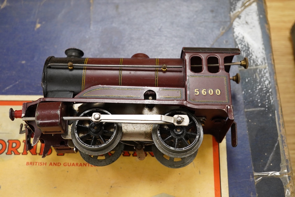Lot 287 , Two Hornby 0 gauge tinplate clockwork train sets; a No.601 LMS Goods Set with 0-4-0 tender locomotive, 5600, in maroon livery, etc., together with a No.501 LNER passenger set with 0-4-0 tender locomotive, 1842, in green