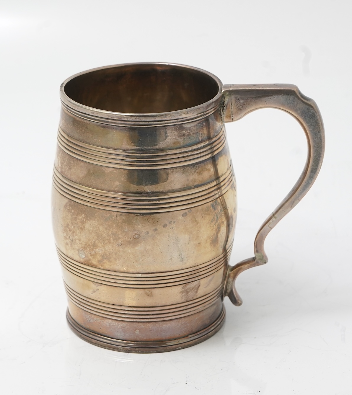 A George III silver barrel mug, by Thomas Meriton, with reeded bands, London, 1798, 10.1cm, 9oz.