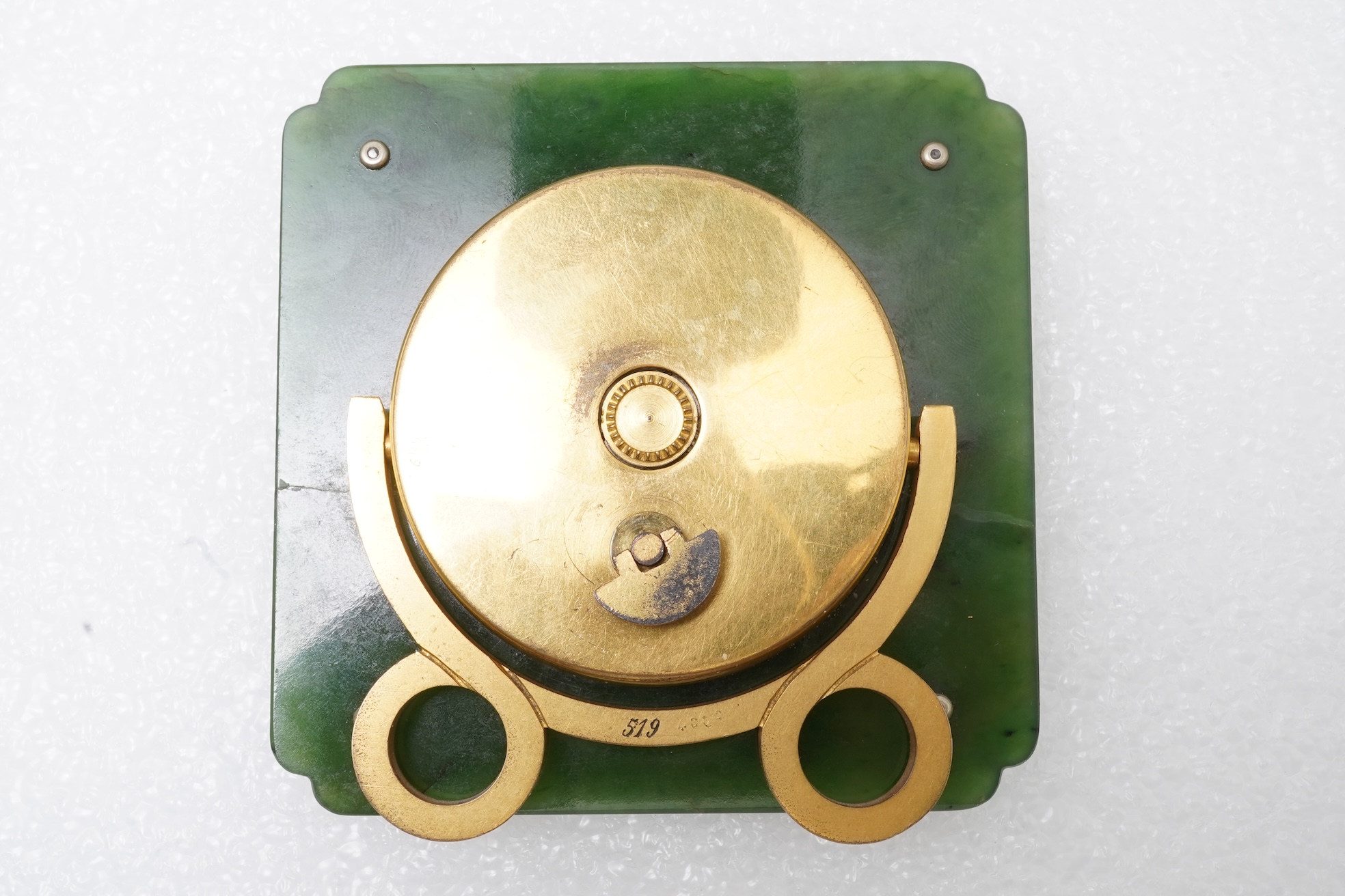 Nephrite is cracked entirely through and restuck, and the dial is possibly a replacement. Cartier signature is an applied plaque to dial- it's possible that this has detached and been restuck as one corner is chipped. Enamel border with shallow ship near A of 'ANNEE'. Not running at time of cataloguing.