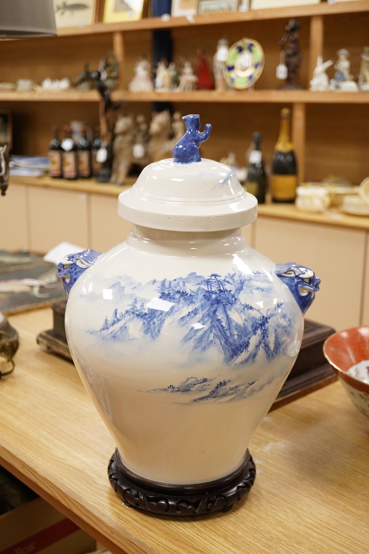 Lot 426 , A Chinese blue and white ovoid shaped vase and cover on stand and a Japanese Kutani bowl decorated with figures, largest 46cm high