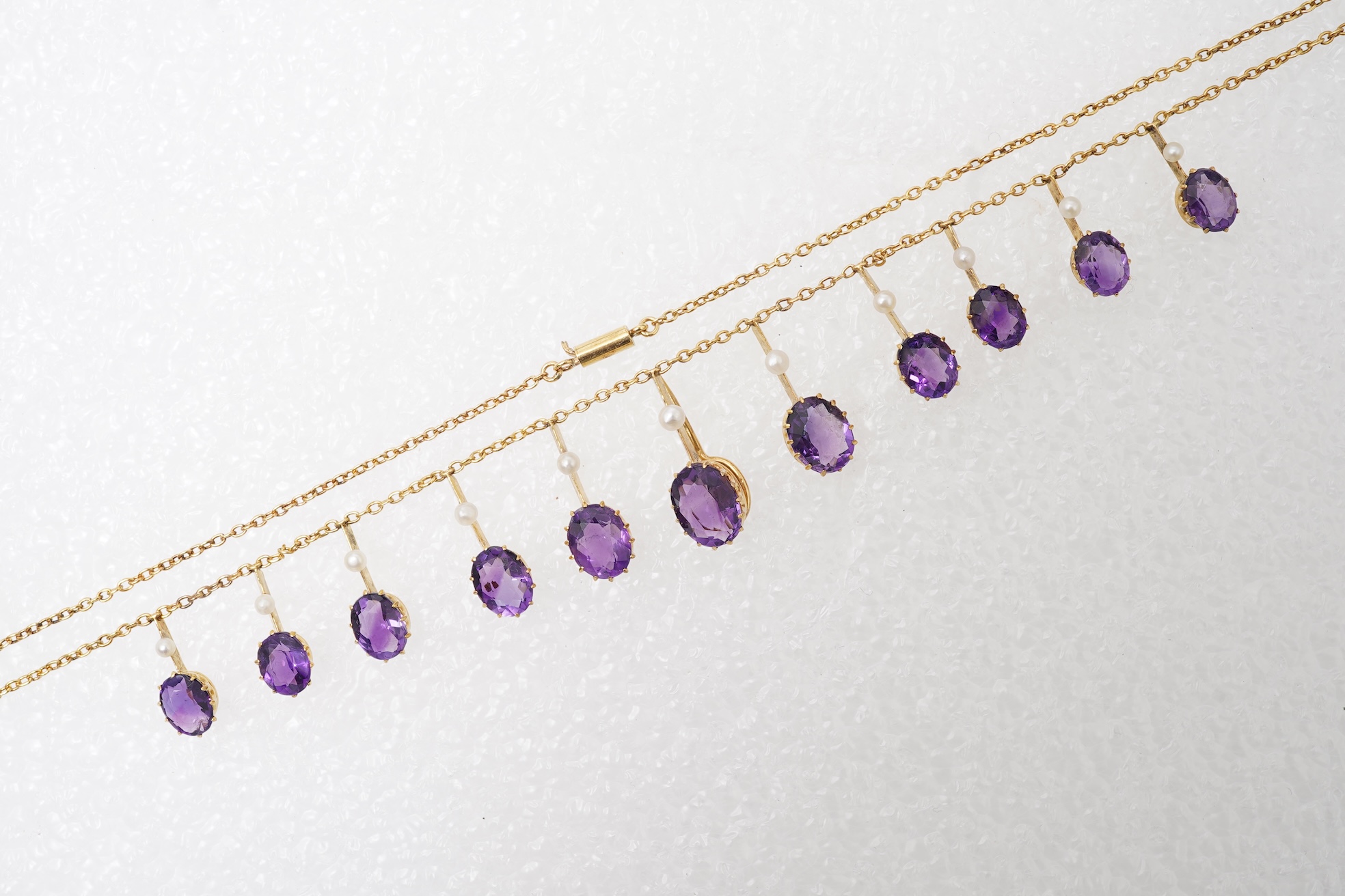 A Victorian amethyst and seed pearl necklace, late 19th century, designed as a fringe of graduated oval amethyst and seed pearl pendants set on knife wire, to a belcher link chain, mounted in gold, length approximately 40cm, longest pendant 2cm, gross weight approximately 9 grams, pearls untested, case stamped Robert Jones & Sons