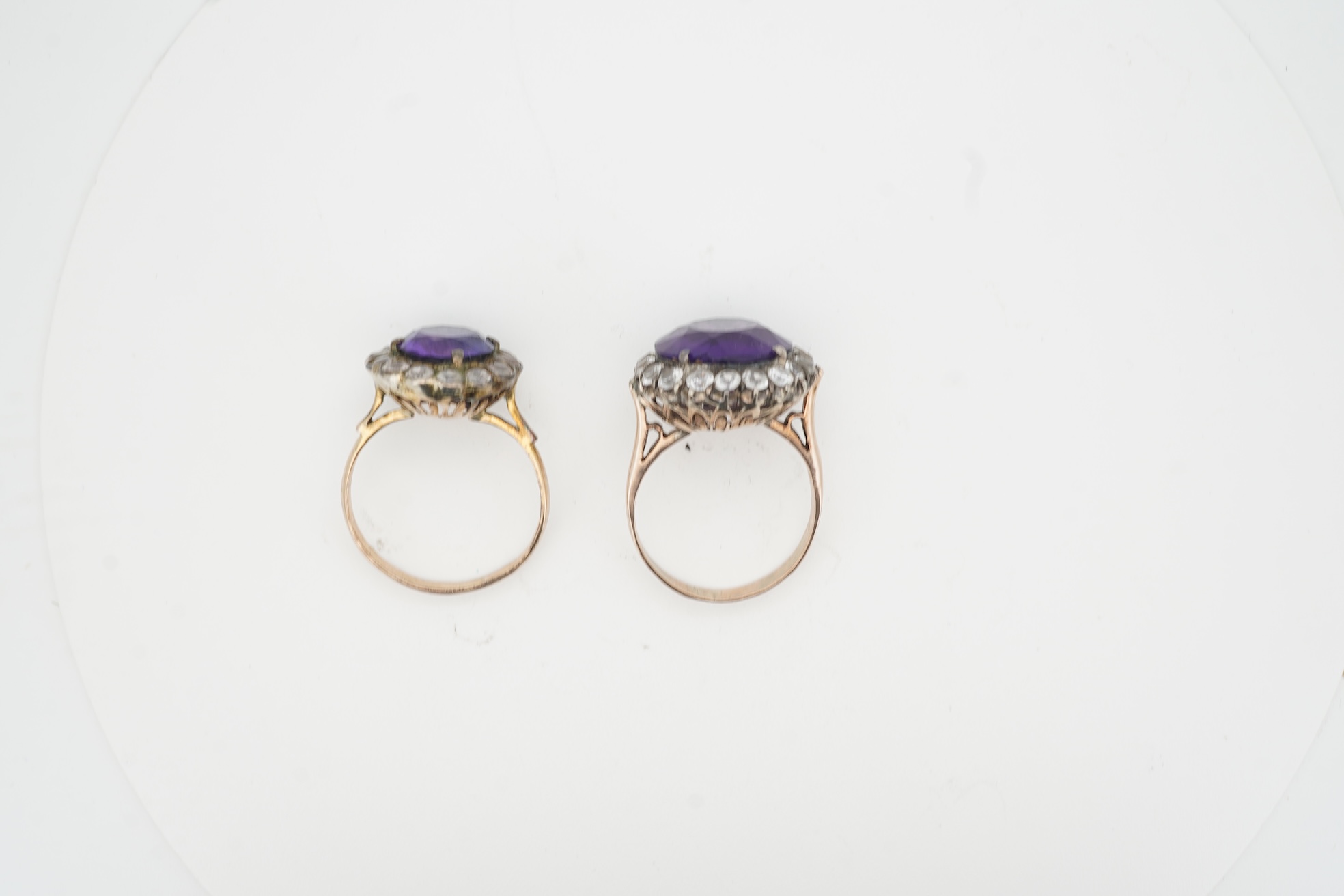 An amethyst and simulant diamond cluster ring, early 20th century, size O, one small stone deficient; and a smaller ring of similar design centring on a circular-cut synthetic violet sapphire within a border of circular-