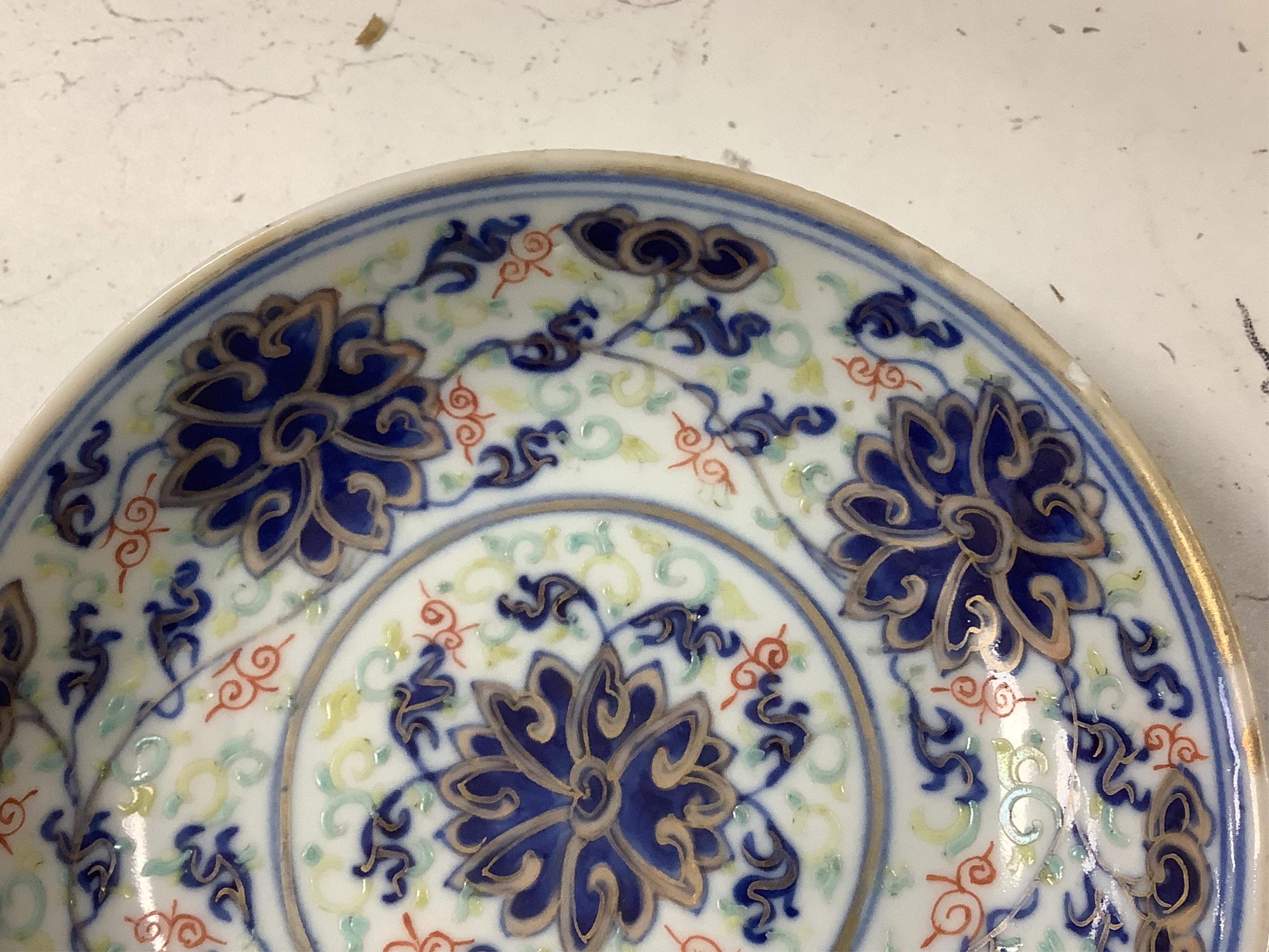 18th century plate five minor shallow nicks at underside of rim, image 4; some wear to centre of plate caused by stacking. Enamelled saucer minor chip to rim, image 5; gilding around rim worn. Tek Sing structurally good although obviously with effects of long-term submersion.