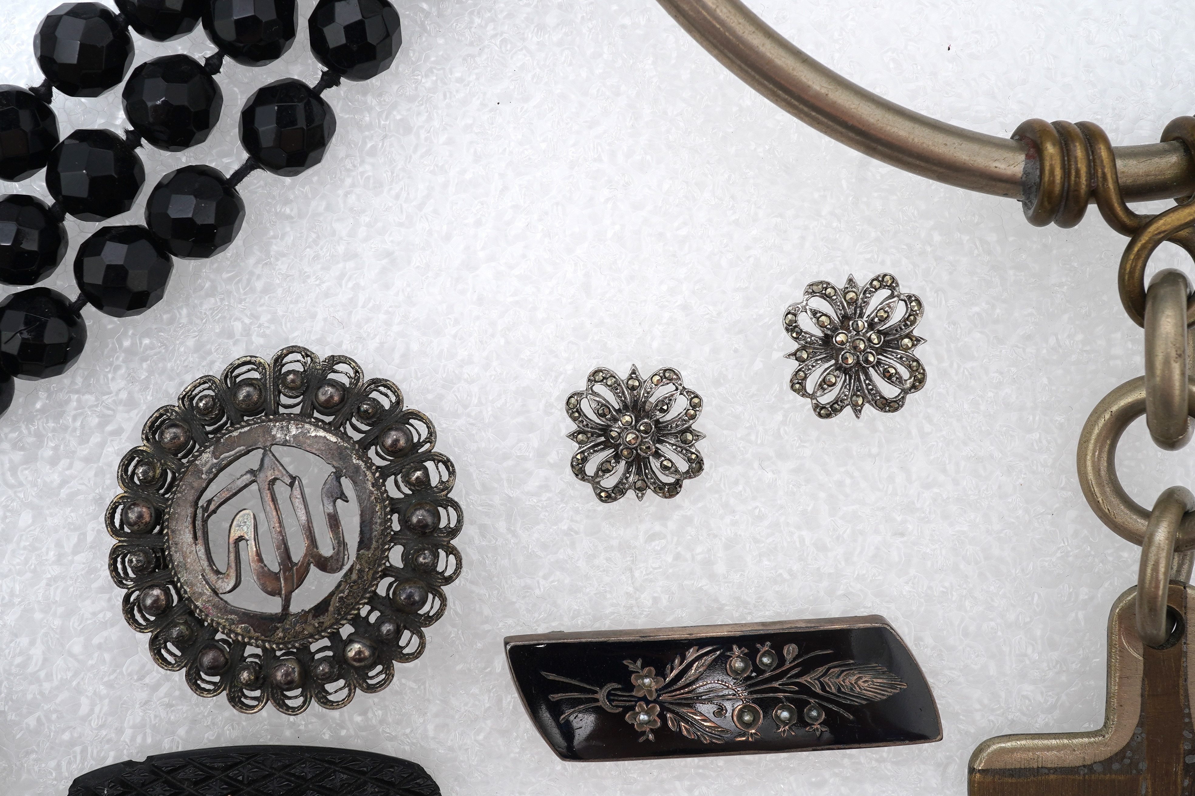 A collection of jewels, comprising: a metal collar necklace suspending a cross pendant; a black glass bead necklace; an amethyst, iolite, moonstone and mother of pearl pendant; a gilt metal pendant containing hairwork; a paste sunburst brooch; a banded onyx brooch; a gilt metal zodiac wheel brooch; a black enamel and seed pearl panel brooch; a drilled Spanish silver coin pendant dated 1738 on a silver chain; a pair of marcasite earrings; a heart-shaped scent bottle fob brooch; a filgree brooch with an Arabic inscription; and a black resin/moulded bog oak brooch centring on a gold and seed pearl trefoil motif