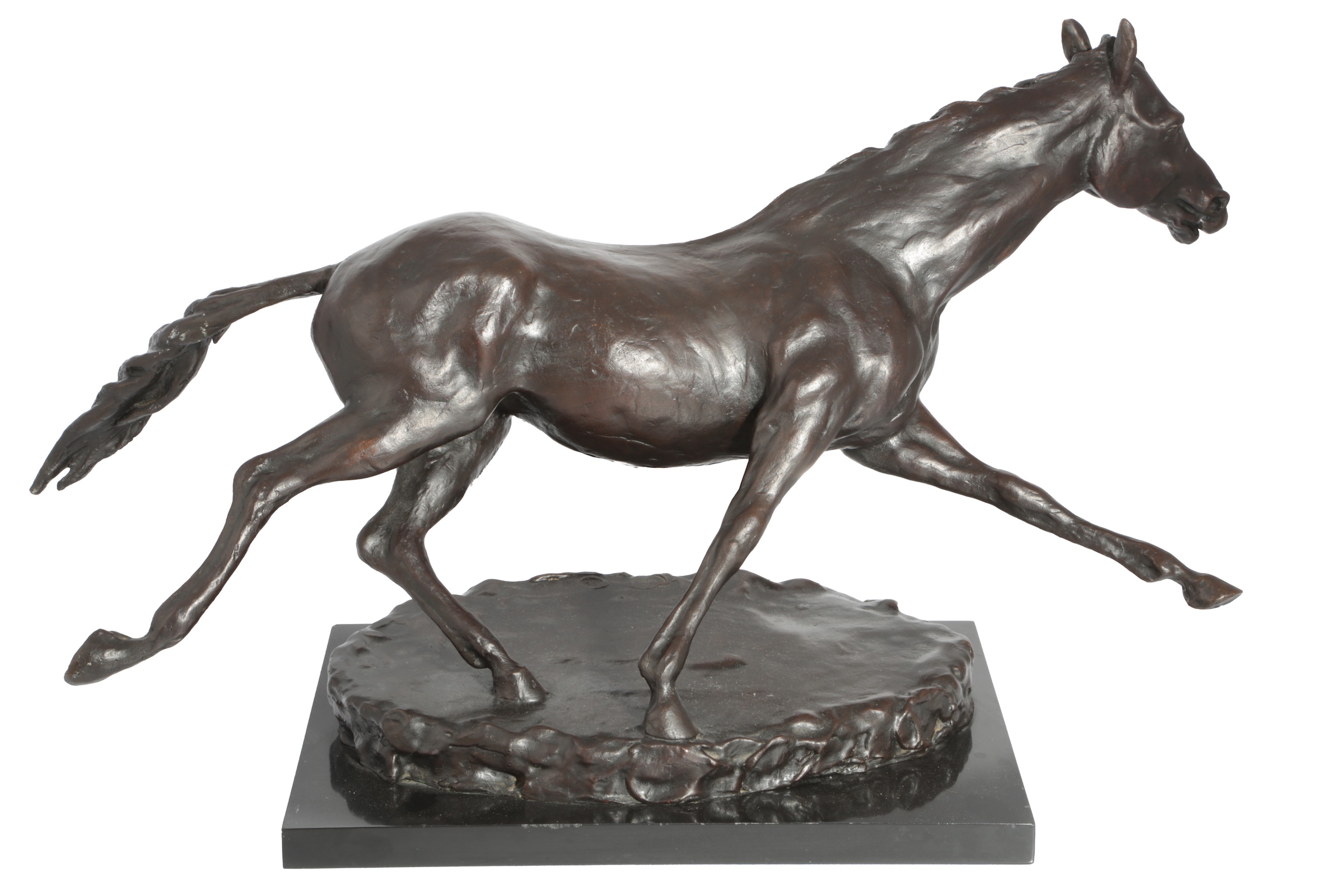 § Enzo Plazzotta (1921-1981). A bronze galloping horse, cast foundry mark and edition number 6/9, on a black slate rectangular, 39cm high, 67cm long