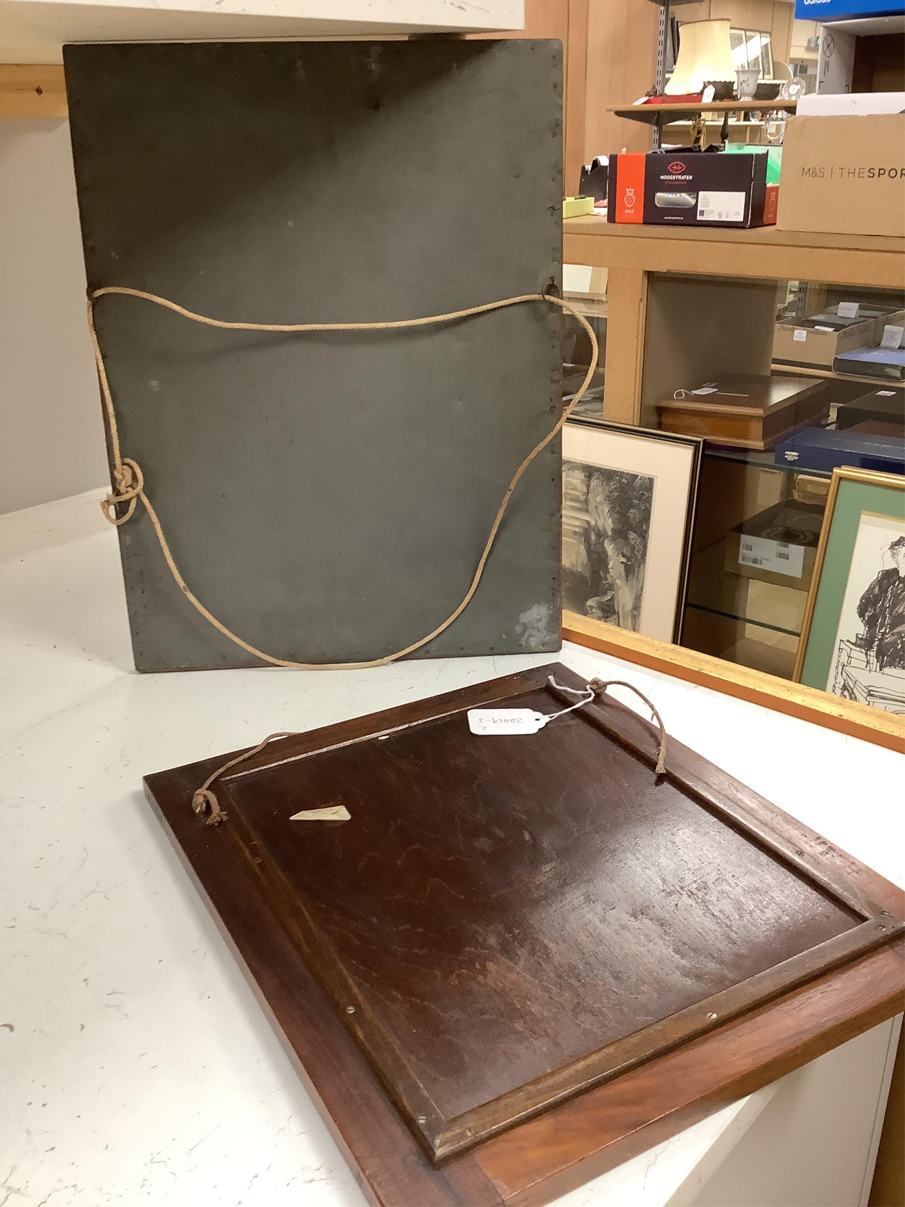 Larger frame with small missing sections at top-right corner, image 4; the other good; both with acceptable signs of age.