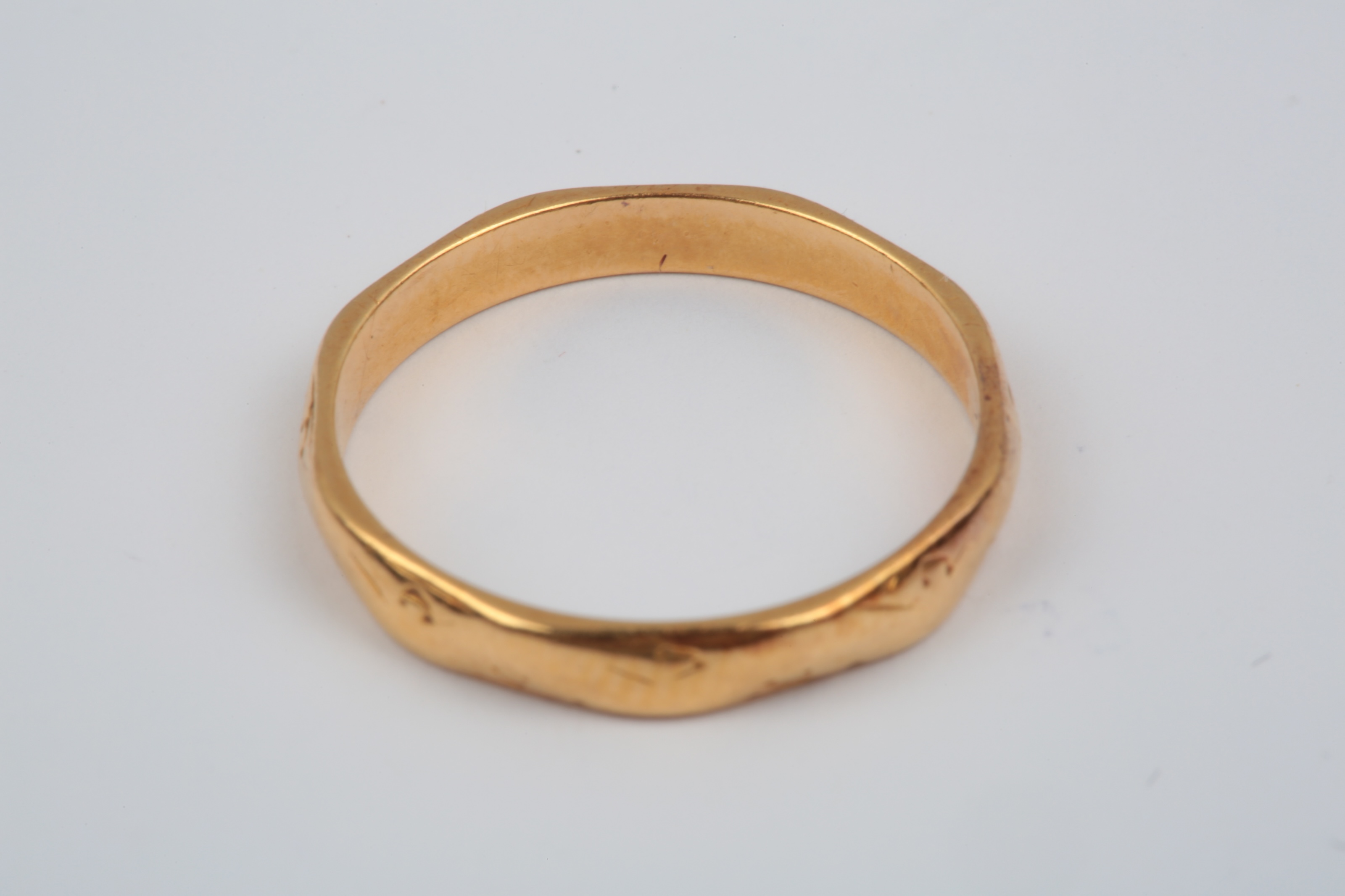 A pearl ring, circa 1894, and a gold wedding band, circa 1956, comprising: a ring set with five pearls, in 18ct gold, size L, British hallmarks, gross weight approximately 3.5 grams, pearls untested; and a 22ct gold wedding ring of faceted design with engraved details, size L1/2, British hallmarks, gross weight approximately 2.4 grams