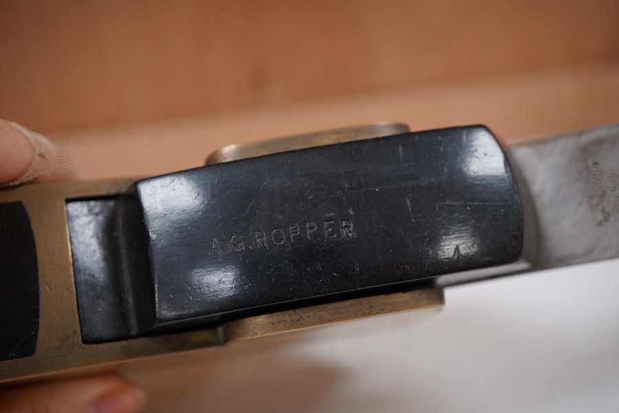 A Preston gun metal shoulder plane with ebony infill and wedge, with original 1 1/2” iron, stamped ‘E. Preston & Sons’ to the back, and with numerous owner stamps to the infill and wedge, the sole 20.5cm long