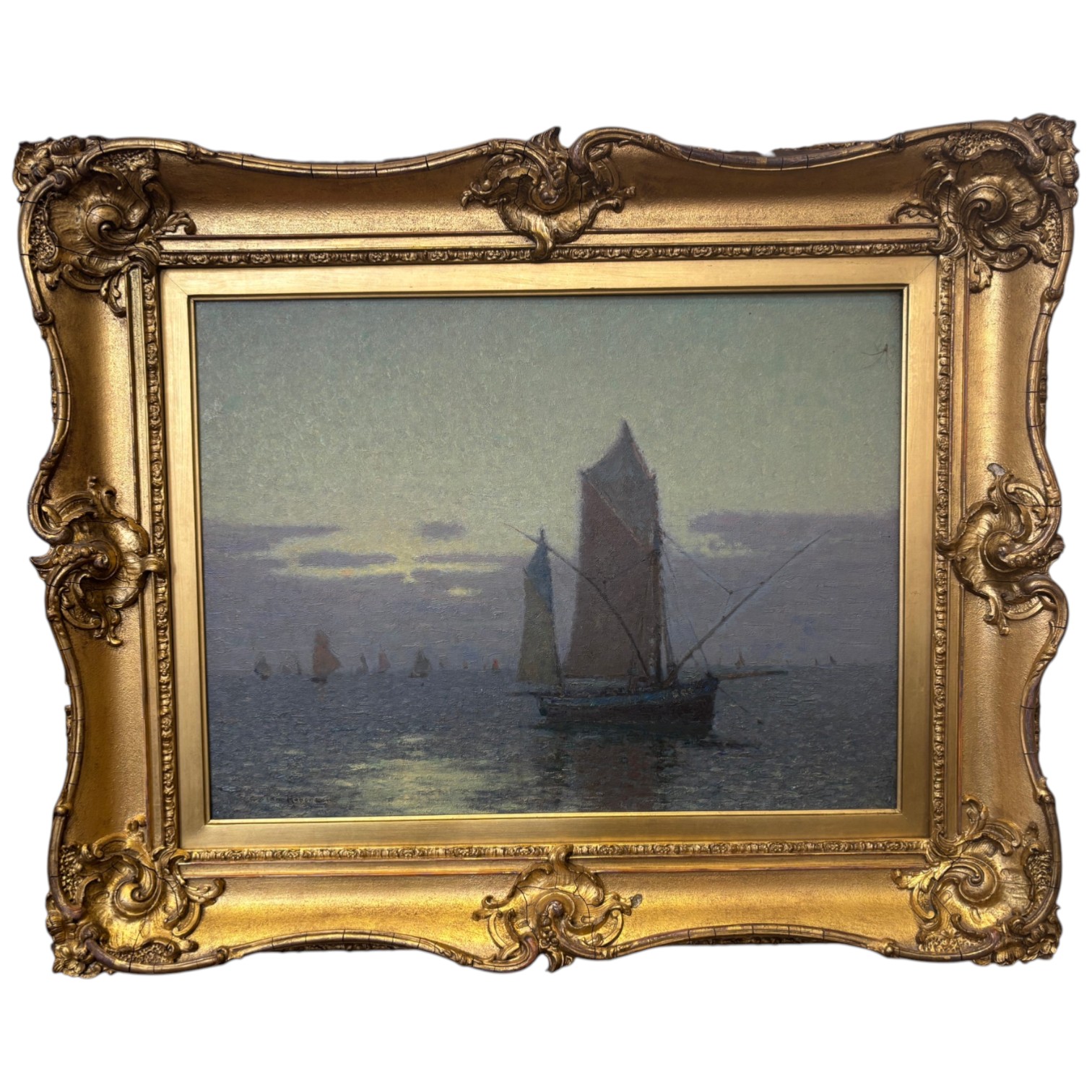 In good, original condition. There is some surface dirt and the painting may benefit from a clean. The frame with cracking throughout and general wear.