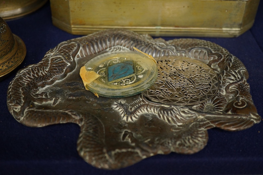 A South-East Asian engraved brass betel nut box, a Japanese bronzed antimony tray and other items, box 20cm