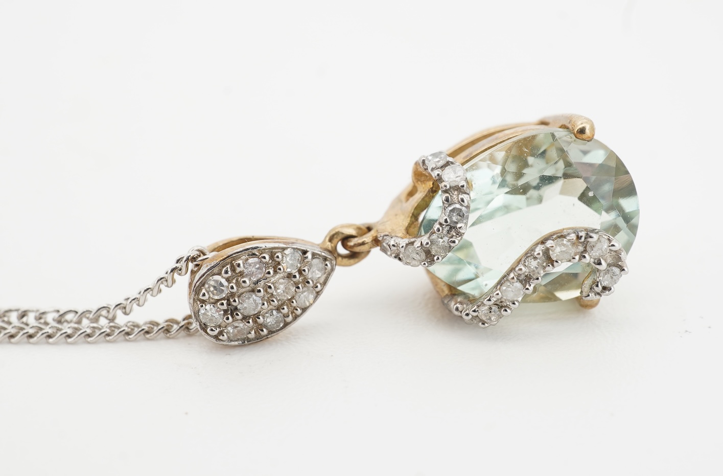 A synthetic prasiolite quartz and diamond pendant, set with a pear-shaped synthetic pale green quartz embellished with curved lines of single-cut diamonds, the bail pavé-set with brilliant-cut diamonds, mounted in 9ct gold, on a 9ct white gold necklace, pendant 1.9cm, necklace 40cm, each with British hallmarks, gross weight approximately 3 grams