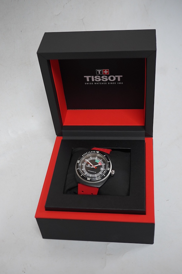 Lot 1094 , A gentleman's recent blackened stainless steel Tissot Powermatic 80 wrist watch, case diameter 40mm, on a Tissot red rubber strap, with box