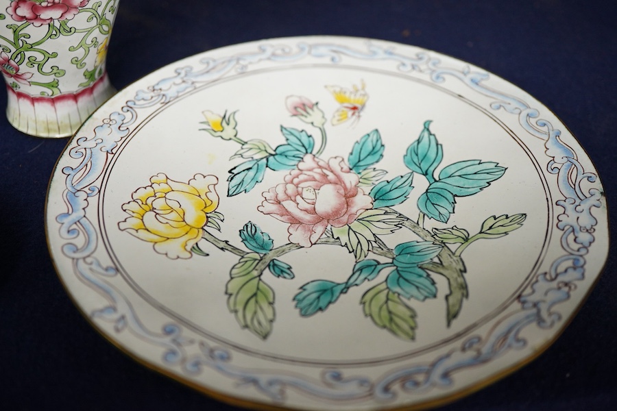 A group of Chinese Canton enamel - an ovoid vase, a circular box and cover, a dish and a brush rest, vase 13cm