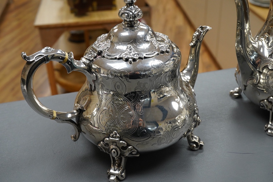 A Victorian silver four piece tea and coffee service by George John Richards & Edward Charles Brown, of baluster form, with engraved scroll decoration, London, 1859 & 1861, gross weight 78.1oz. CITES Submission reference 7ZVYHZP5