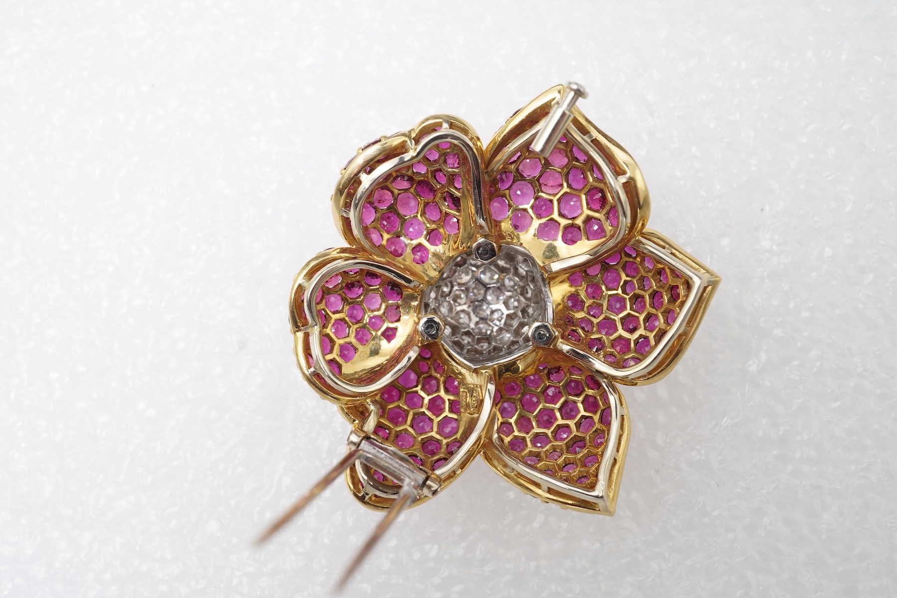 A ruby and diamond brooch, Italy, designed as a flower, the centre pavé-set with brilliant-cut diamonds totalling approximately 2.00 carats, to petals pavé-set with circular-cut rubies, mounted in gold, length 4.8cm, Italian maker's mark 2747 AL, stamped 750, gross weight approximately 30 grams