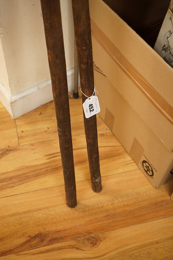 Lot 452 , A Chinese red lacquer stand, 24.5cm high. A leatherette mounted octagonal easel mirror, 68cm. A pair of tribal paddles, 180 cm long