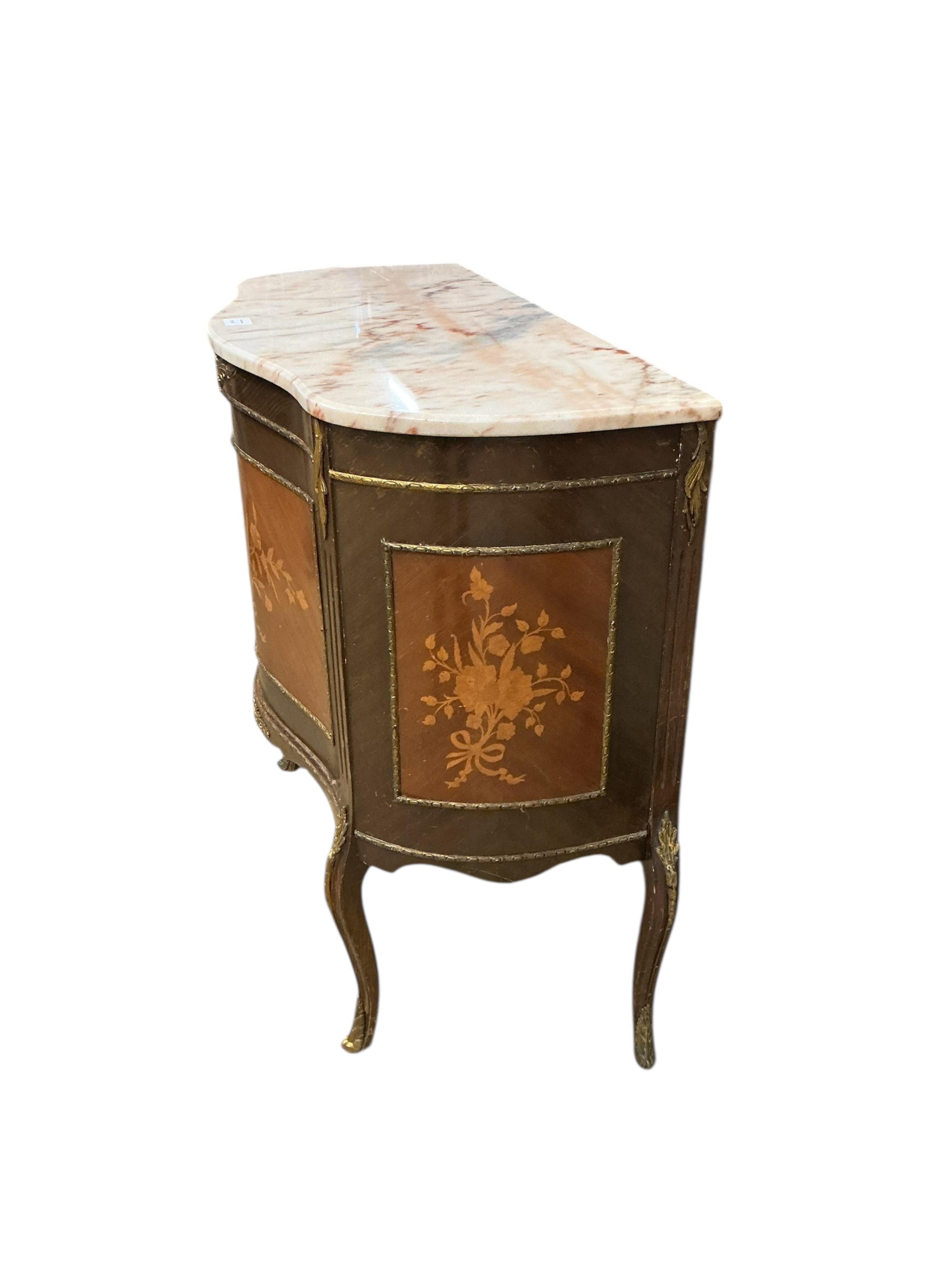 Lot 140 , A reproduction Louis XVI style serpentine marble top side cabinet, width 89cm, depth 43cm, height 83cm