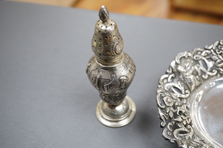 A cased set of four late Victorian silver salts and four matching spoons, Birmingham, 1893, a pair of German metal pepperettes, a Victorian silver extinguisher and a continental white metal bowl, with pierced border.
