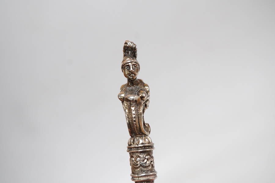 A pair of Victorian silver spoons and matching sifter spoon, each terminal modelled as the bust of a lady, by Henry Holland, London, 1868/1870, 16.7cm et infra, 5.3oz.