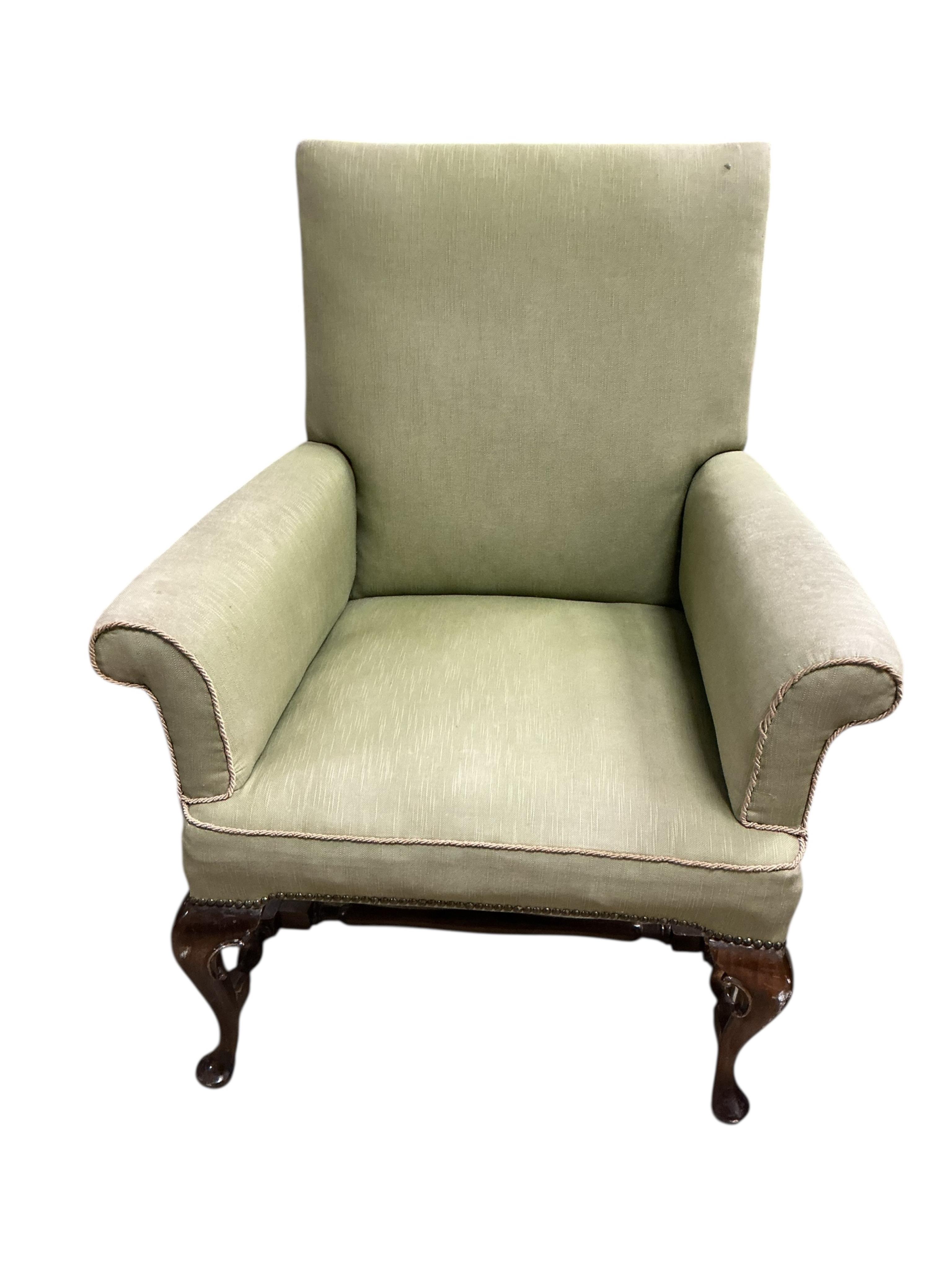 A pair of George I style upholstered armchairs, width 80cm, depth 60cm, height 100cm