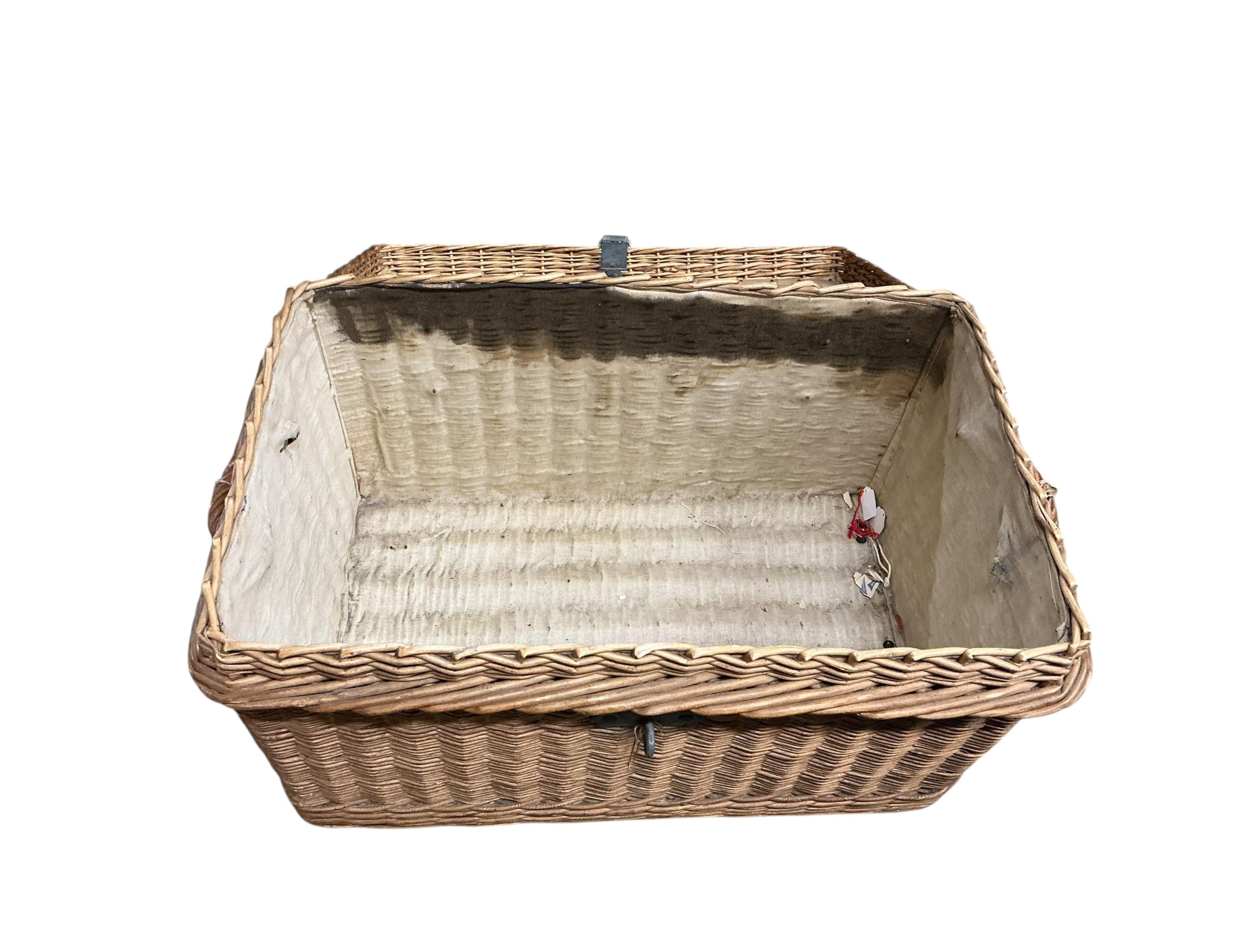 Lot 129 , A vintage zinc mounted wicker laundry hamper, width 84cm, depth 53cm, height 52cm