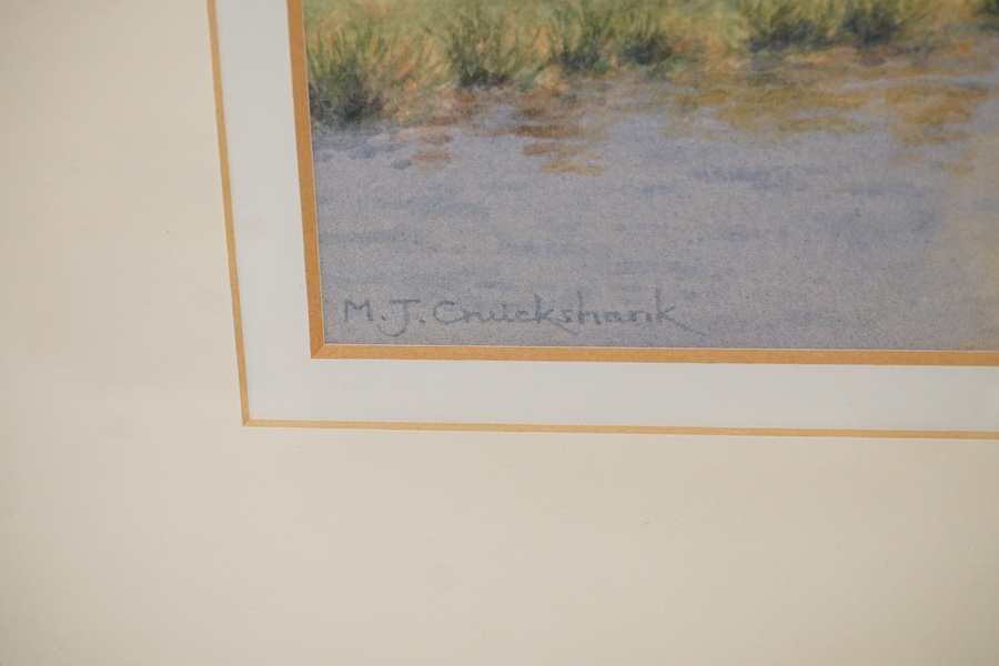 Michael J. Cruikshank (contemporary), ‘Riverside Pastures’ and ‘Watery Moon Reflections’, each signed, Bradness Gallery labels verso, two watercolours, largest 30 x 52cm