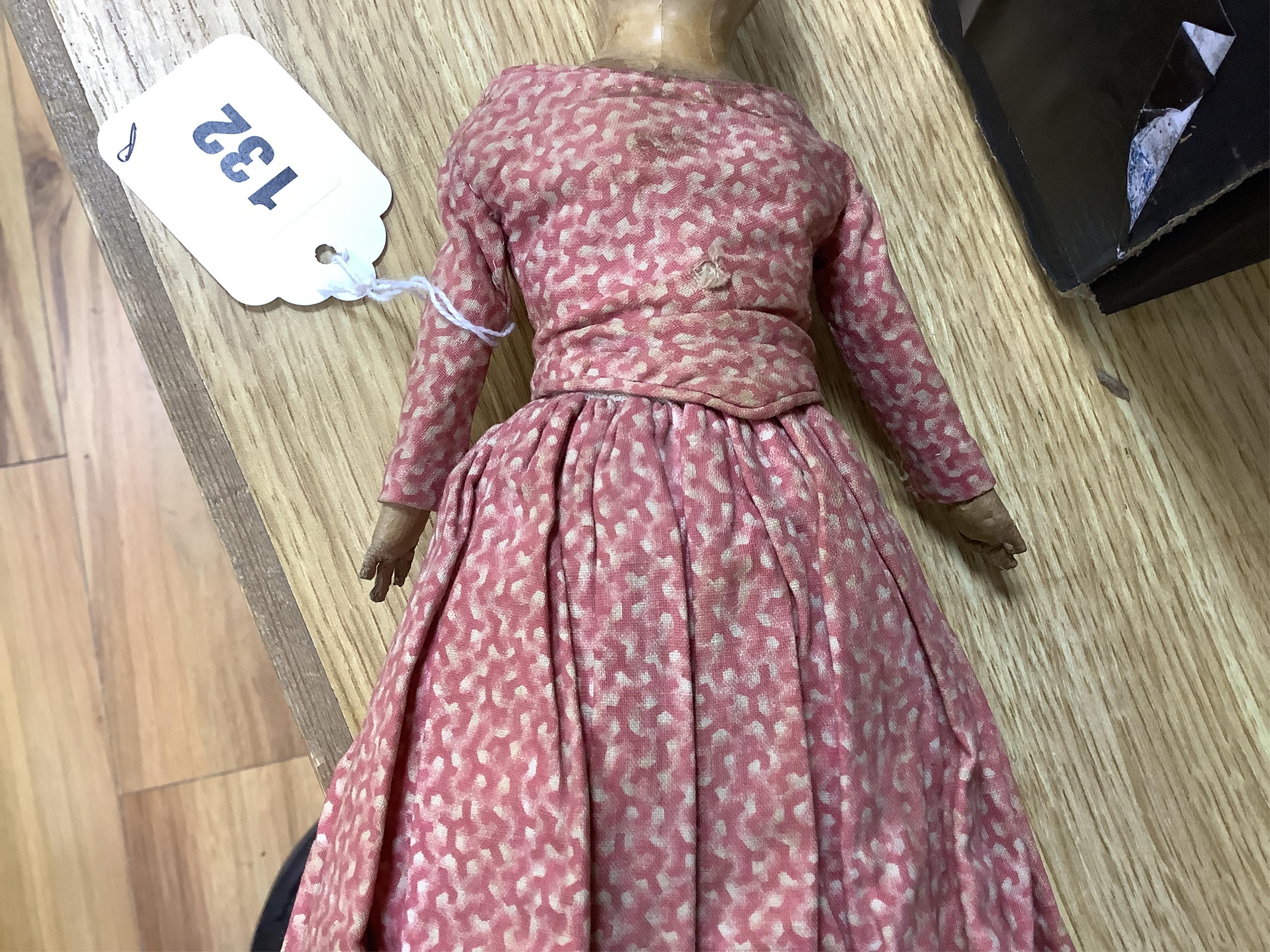 Lot 132 , An early 19th century wax over composition head and shoulder doll, with contemporary costume, 33cm long overall