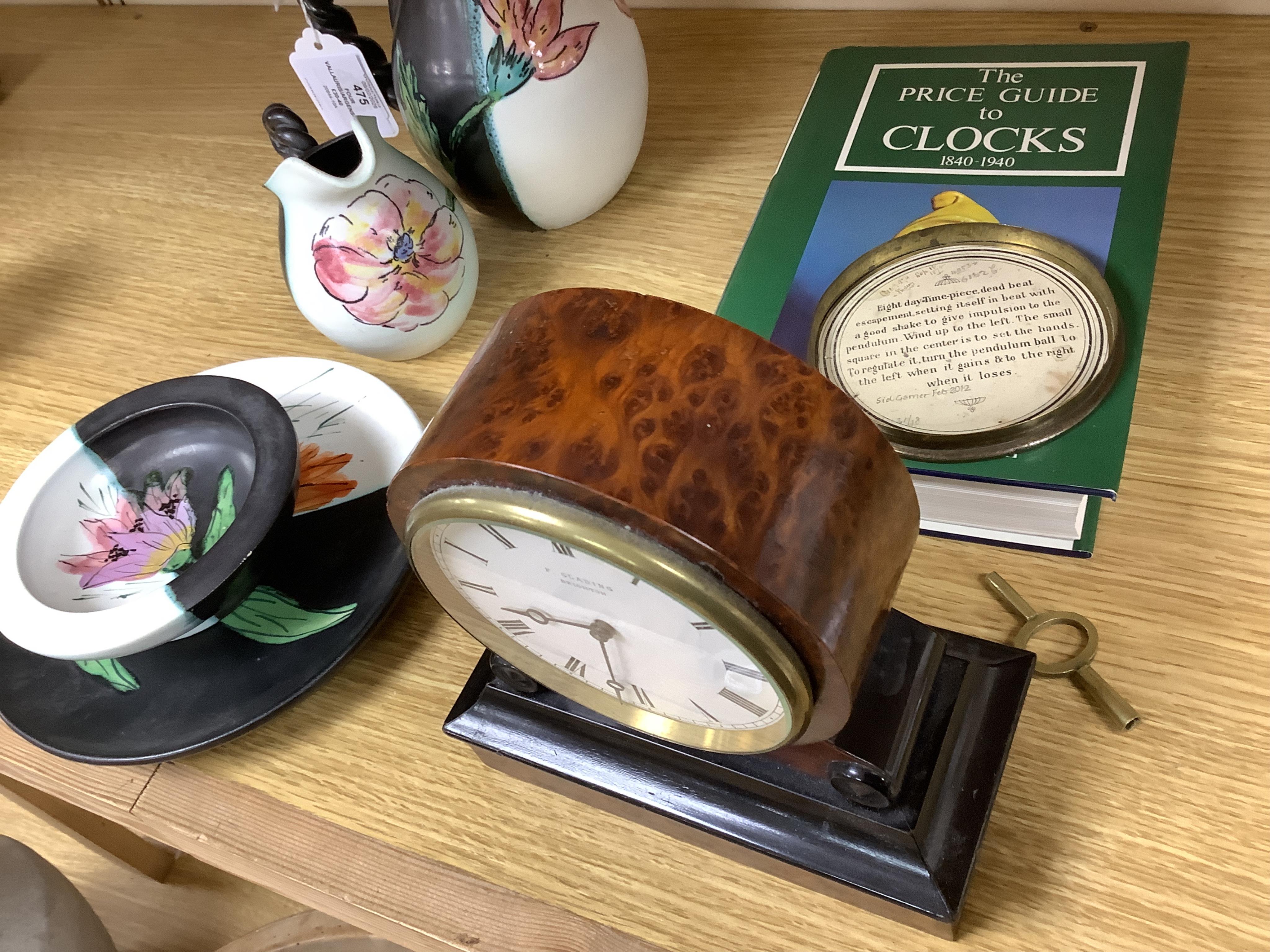 A late 19th century mantel timepiece with French movement, the dial inscribed F. Glading, Brighton, with key, 17cm high, together with Shenton price guide