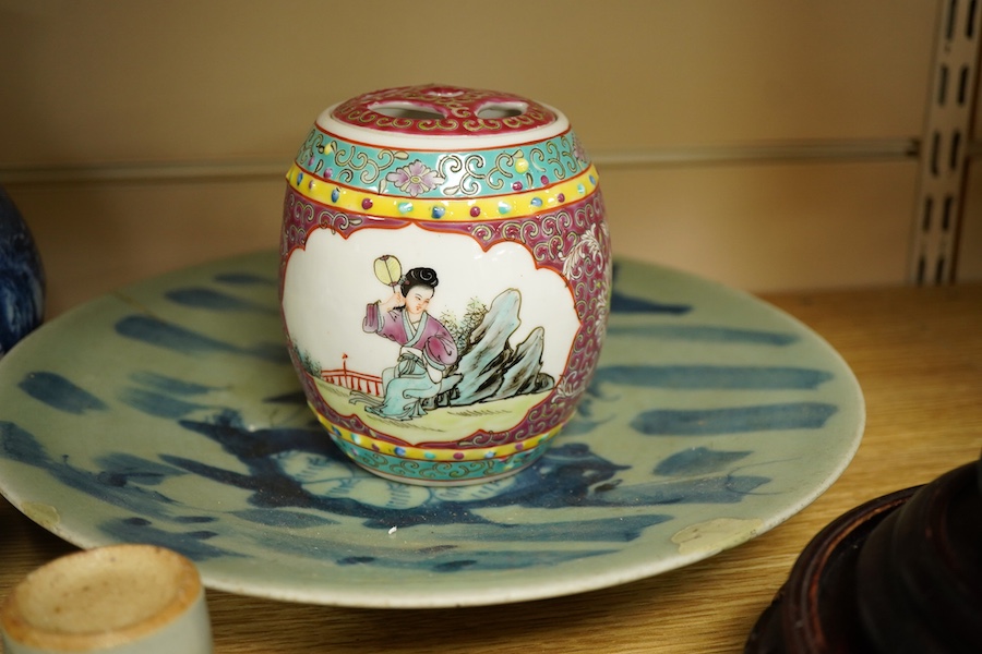 A collection of mixed Chinese blue and white china, enamelware and wooden stands, blue and white vase 16.5cm high