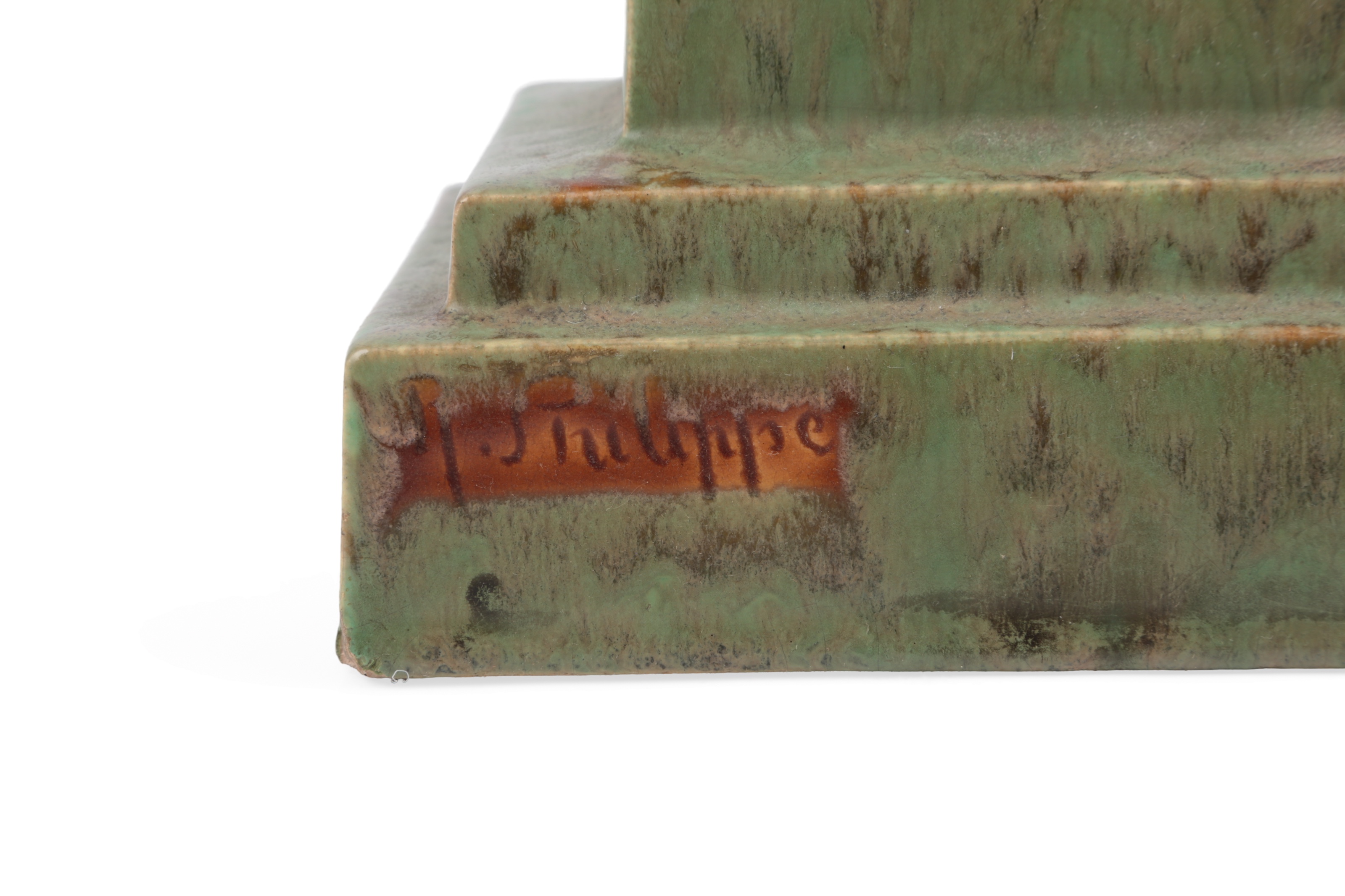 Abel Rene Philippe (French, 1898-1978) 'Mother and Child' an Art Deco style glazed pottery of a mother and daughter, the child modelled on her mother's back, the mother knelt on a swagged pedestal, signed verso, 55cm high x 29cm wide x 12cm deep
