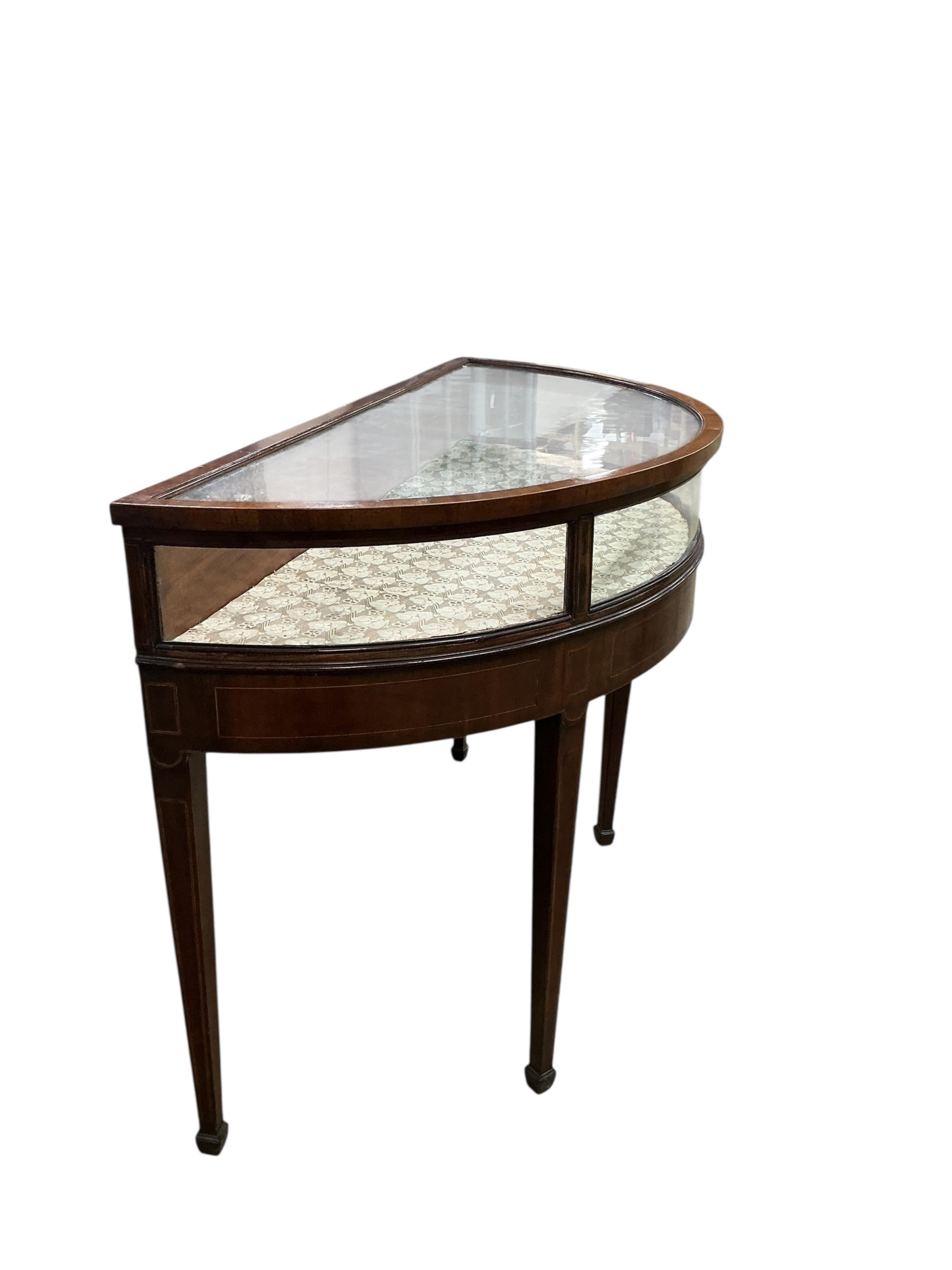 A George III demi lune mahogany bijouterie table, width 114cm, depth 53cm, height 85cm