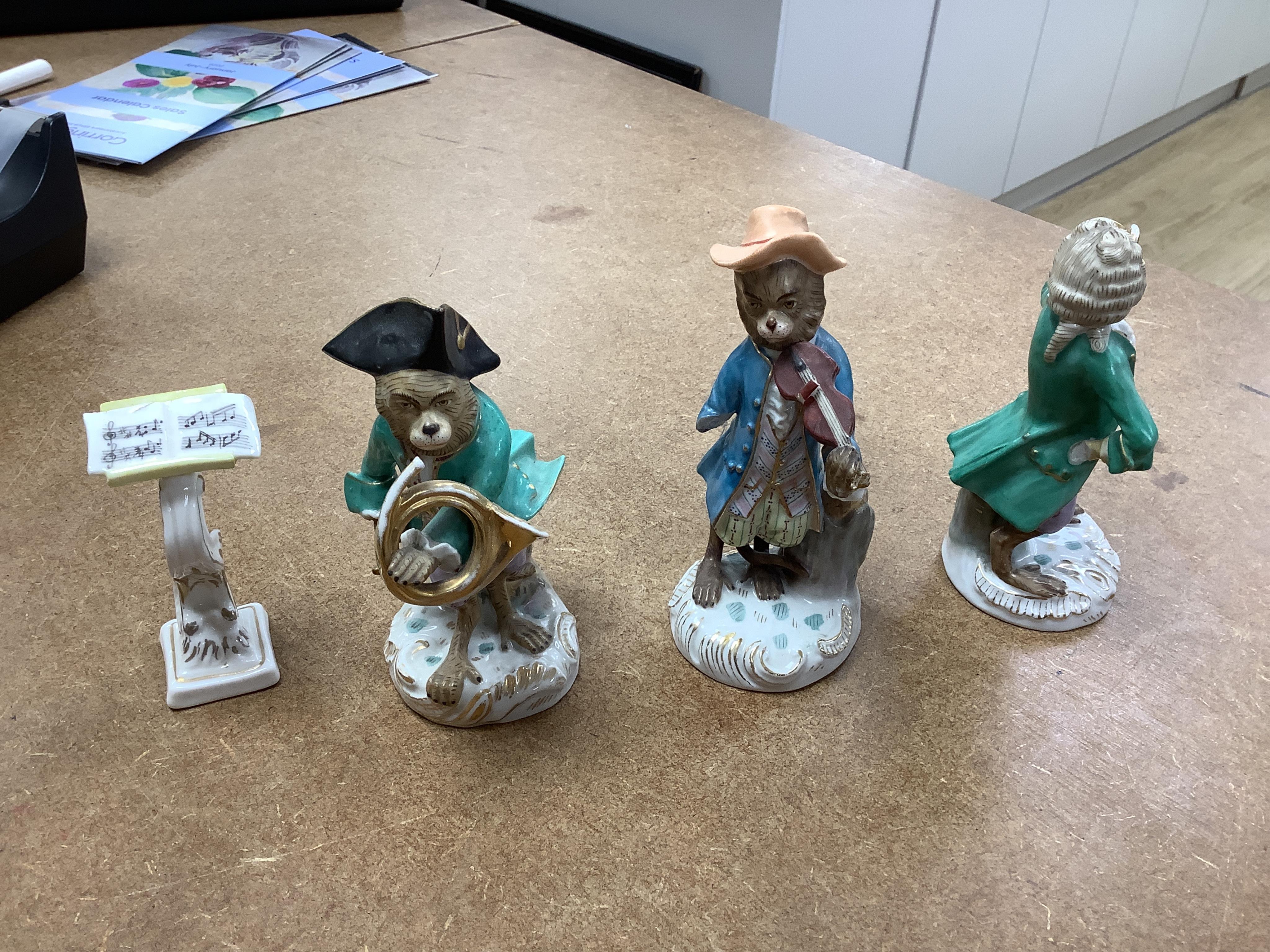Lot 1325 , A collection of Dresden monkey band figures, tallest 17cm, (15).