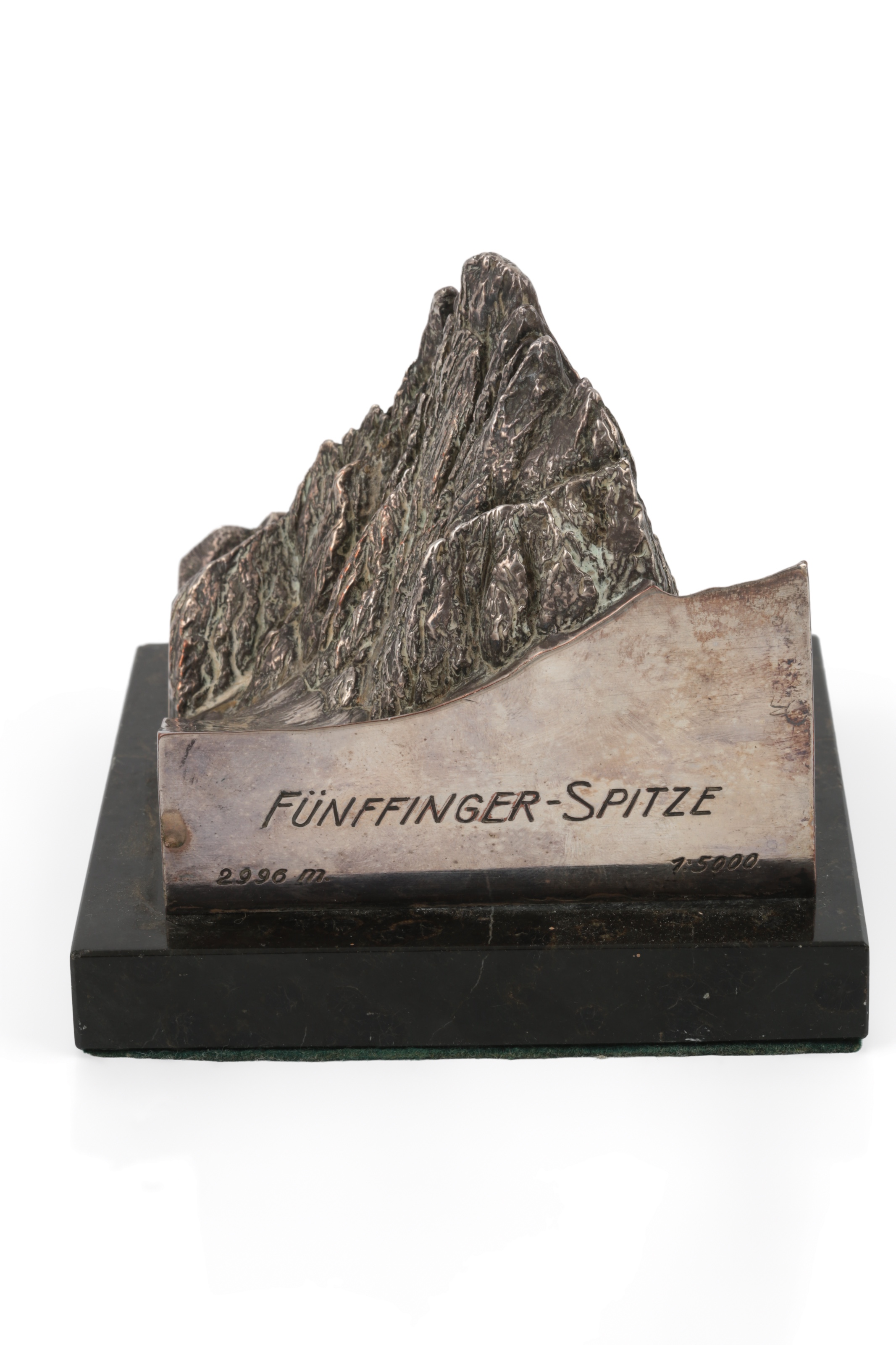 Xaver Imfeld (Swiss, 1853-1909) for WMF: 'Eiger, Mönch u Jungfrau' a topographic scale model of Alpine mountains, produced by the Scholl Brothers, Zurich, silver plate, 13.5cm wide, raised on a rectangular black marble base, 16cm wide overall; together with another similar model 'Fünffinger-Spitze', by L. Hegerter Jng., 12cm wide overall (2)
