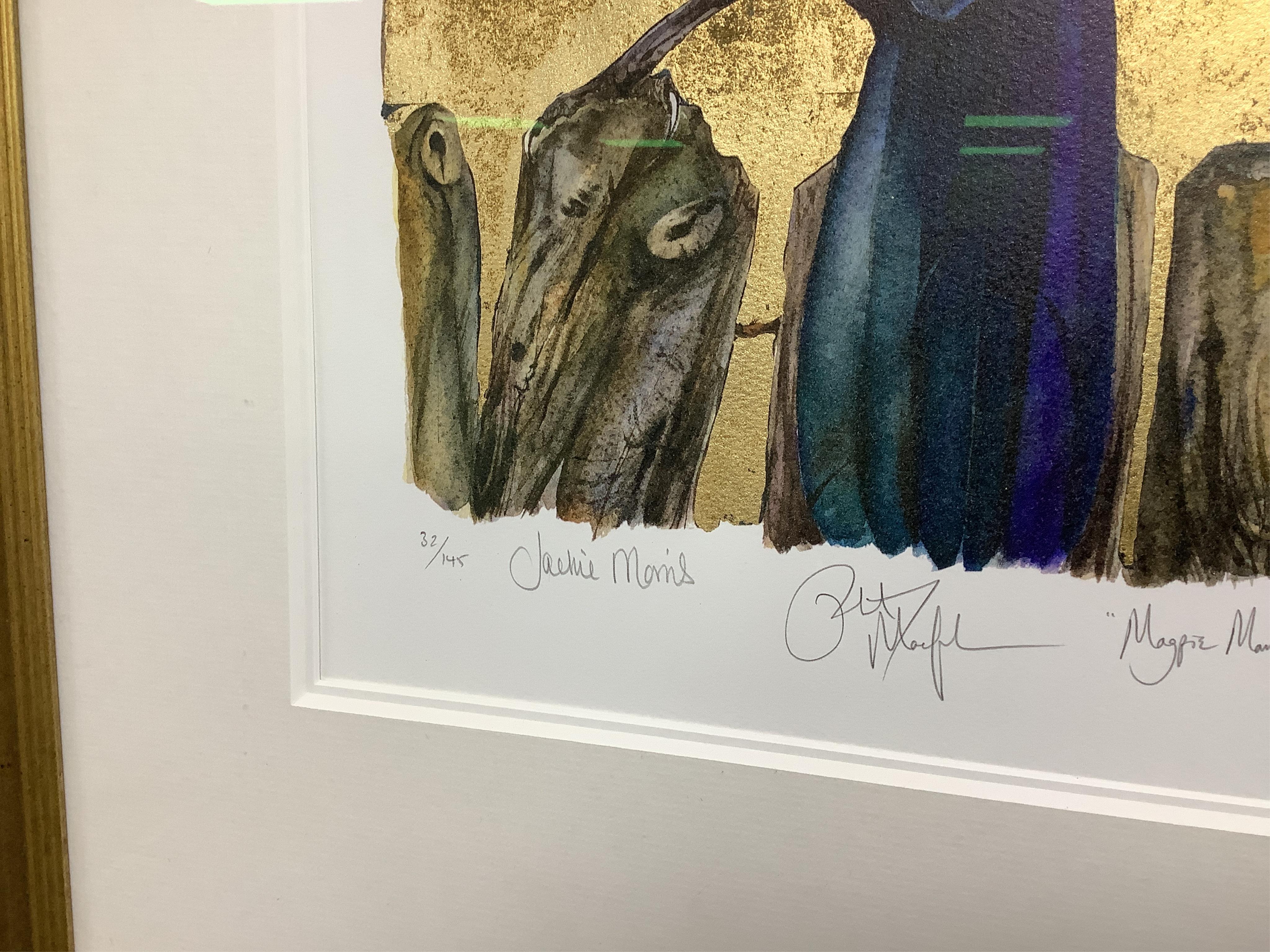 Lot 3269 , Jackie Morris (b.1961), ‘Magpie Manifesto’, signed in pencil by the artist and Robert MacFarlane, limited edition 32/145, giclee print with gold leaf, 44 x 32cm