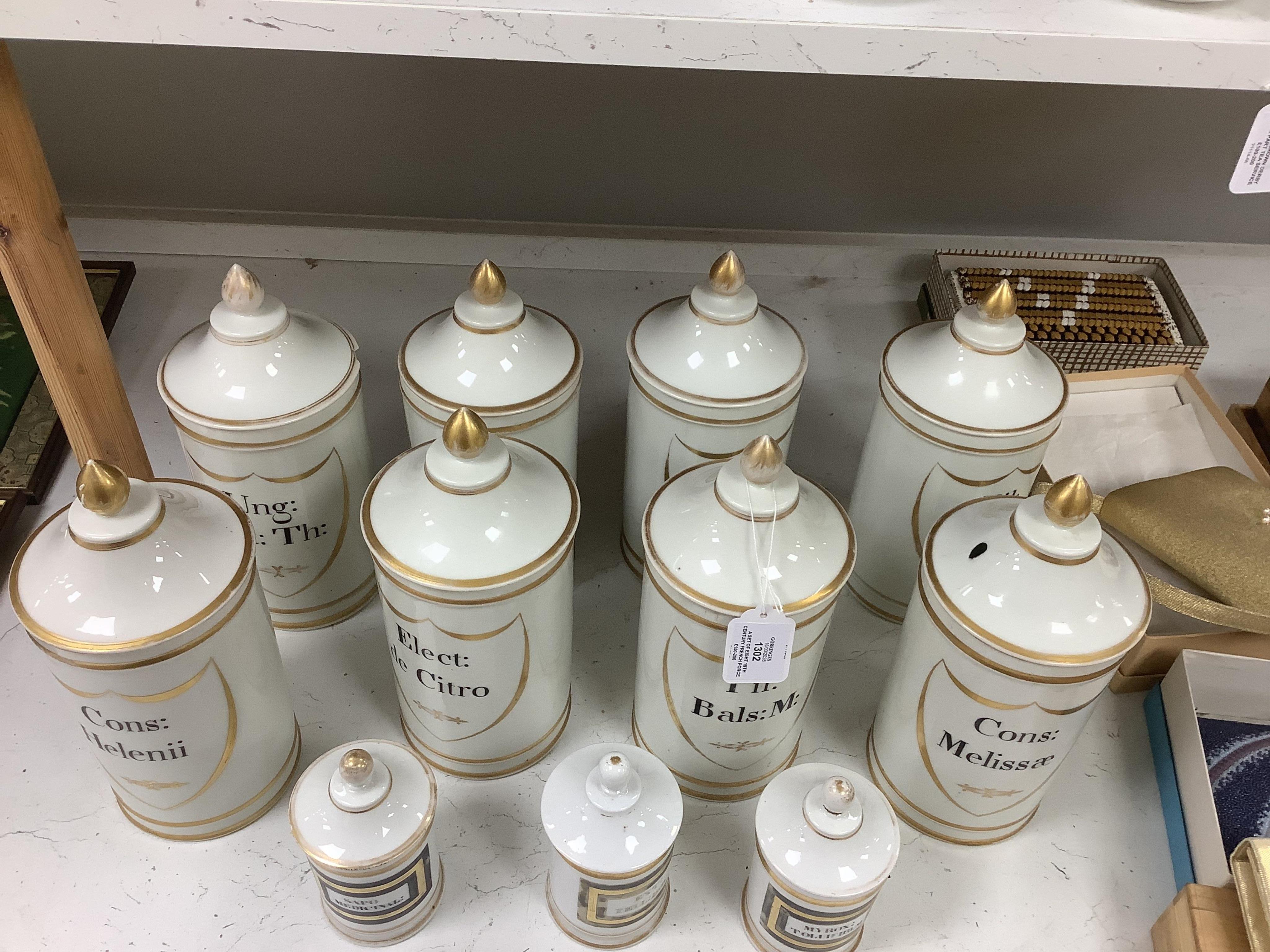 Lot 1302 , A set of eight 19th century French porcelain pharmacy jars and covers and three similar smaller jars, largest each 29cm high