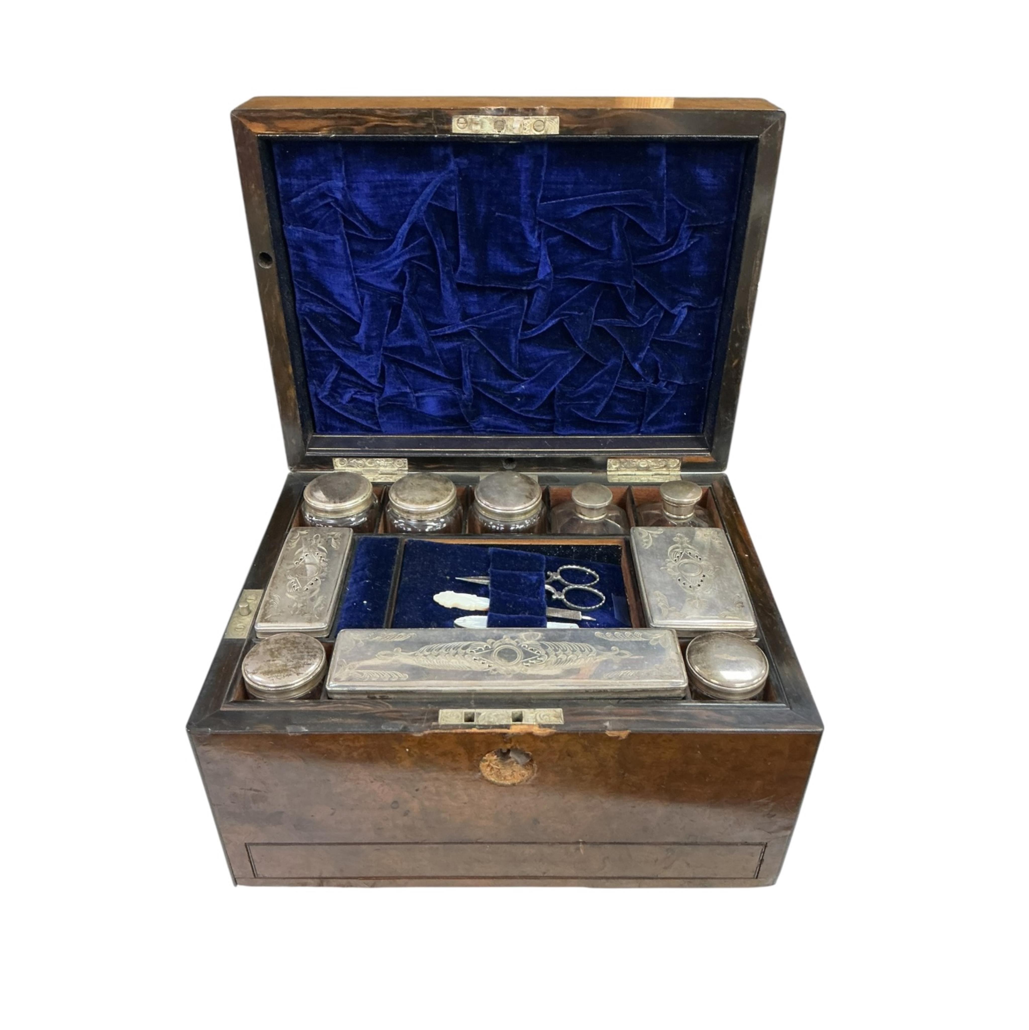 Lot 1332 , A Victorian coromandel wood fitted travelling dressing box, blue velvet interior with silver plated topped glass jars, other accessories, and a central tray of grooming implements, box height 19cm, width 30cm, depth 23cm