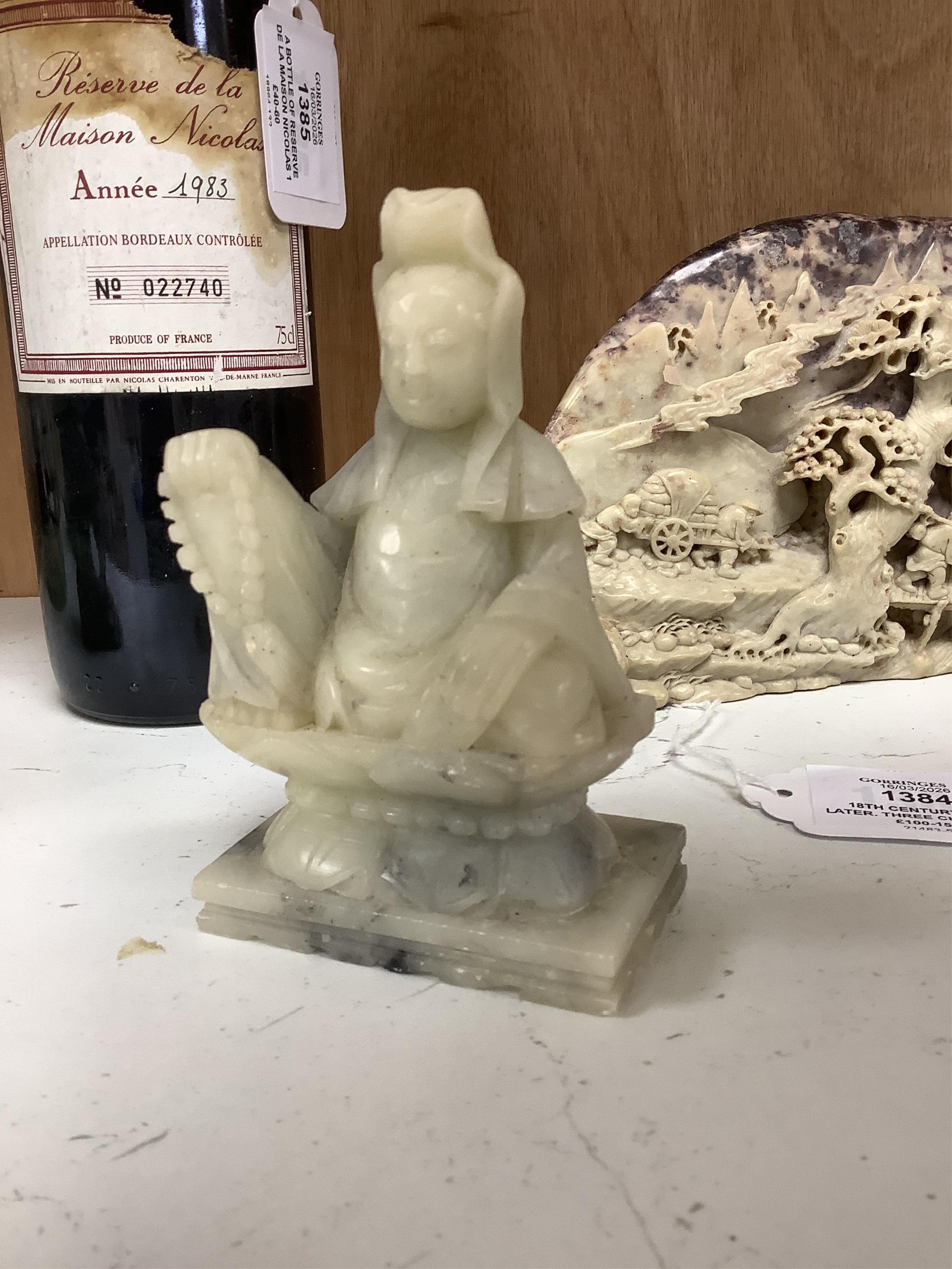 Lot 1384 , 18th century and later. Three Chinese soapstone carvings, largest 12cm high & 25cm wide.